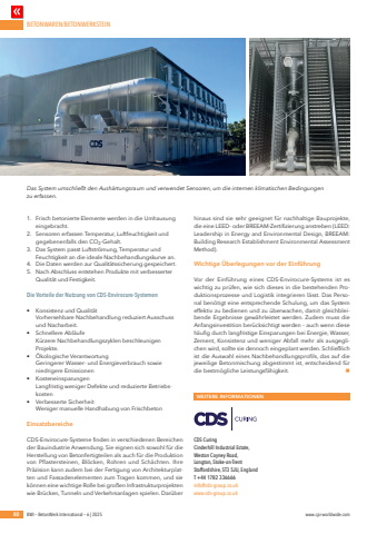 BETONWAREN/BETONWERKSTEIN80 BWI %u2013 BetonWerk International %u2013 6 | 2025 www.cpi-worldwide.com1. Frisch betonierte Elemente werden in die Umhausung eingebracht.2. Sensoren erfassen Temperatur, Luftfeuchtigkeit und gegebenenfalls den CO2-Gehalt.3. Das System passt Luftstr%u00f6mung, Temperatur und Feuchtigkeit an die ideale Nachbehandlungskurve an.4. Die Daten werden zur Qualit%u00e4tssicherung gespeichert.5. Nach Abschluss entstehen Produkte mit verbesserter Qualit%u00e4t und Festigkeit.Die Vorteile der Nutzung von CDS-Envirocure-Systemen%u2022 Konsistenz und Qualit%u00e4t Vorhersehbare Nachbehandlung reduziert Ausschuss und Nacharbeit.%u2022 Schnellere Abl%u00e4ufe K%u00fcrzere Nachbehandlungszyklen beschleunigen Projekte.%u2022 %u00d6kologische Verantwortung Geringerer Wasser- und Energieverbrauch sowie niedrigere Emissionen%u2022 KosteneinsparungenLangfristig weniger Defekte und reduzierte Betriebskosten%u2022 Verbesserte SicherheitWeniger manuelle Handhabung von FrischbetonEinsatzbereicheCDS-Envirocure-Systeme finden in verschiedenen Bereichen der Bauindustrie Anwendung. Sie eignen sich sowohl f%u00fcr die Herstellung von Betonfertigteilen als auch f%u00fcr die Produktion von Pflastersteinen, Bl%u00f6cken, Rohren und Sch%u00e4chten. Ihre Pr%u00e4zision kann zudem bei der Fertigung von Architekturplatten und Fassadenelementen zum Tragen kommen, und sie k%u00f6nnen eine wichtige Rolle bei gro%u00dfen Infrastrukturprojekten wie Br%u00fccken, Tunneln und Verkehrsanlagen spielen. Dar%u00fcber hinaus sind sie sehr geeignet f%u00fcr nachhaltige Bauprojekte, die eine LEED- oder BREEAM-Zertifizierung anstreben (LEED: Leadership in Energy and Environmental Design, BREEAM: Building Research Establishment Environmental Assessment Method).Wichtige %u00dcberlegungen vor der Einf%u00fchrungVor der Einf%u00fchrung eines CDS-Envirocure-Systems ist es wichtig zu pr%u00fcfen, wie sich dieses in die bestehenden Produktionsprozesse und Logistik integrieren l%u00e4sst. Das Personal ben%u00f6tigt eine entsprechende Schulung, um das System effektiv zu bedienen und zu %u00fcberwachen, damit gleichbleibende Ergebnisse gew%u00e4hrleistet werden. Zudem muss die Anfangsinvestition ber%u00fccksichtigt werden %u2013 auch wenn diese h%u00e4ufig durch langfristige Einsparungen bei Energie, Wasser, Zement, Konsistenz und weniger Abfall mehr als ausgeglichen wird, sollte sie dennoch eingeplant werden. Schlie%u00dflich ist die Auswahl eines Nachbehandlungsprofils, das auf die jeweilige Betonmischung abgestimmt ist, entscheidend f%u00fcr die bestm%u00f6gliche Leistungsf%u00e4higkeit. nWEITERE INFORMATIONENCDS Curing Cinderhill Industrial Estate,Weston Coyney Road,Longton, Stoke-on-TrentStaffordshire, ST3 5JU, EnglandT +44 1782 336666 info@cds-group.co.uk www.cds-group.co.ukDas System umschlie%u00dft den Aush%u00e4rtungsraum und verwendet Sensoren, um die internen klimatischen Bedingungen zu erfassen.