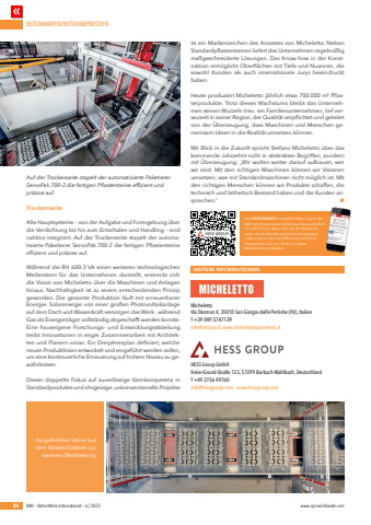 BETONWAREN/BETONWERKSTEIN86 BWI %u2013 BetonWerk International %u2013 6 | 2025 www.cpi-worldwide.comWEITERE INFORMATIONENMichelettoVia Desman 4, 35010 San Giorgio delle Pertiche (Pd), ItalienT +39 049 5747139info@micpav.it, www.michelettopavimenti.itHESS Group GmbH Freier-Grund-Stra%u00dfe 123, 57299 Burbach-Wahlbach, Deutschland T +49 2736 49760 info@hessgroup.com , www.hessgroup.comTrockenseiteAlle Hauptsysteme %u2013 von der Aufgabe und Formgebung %u00fcber die Verdichtung bis hin zum Entschalen und Handling %u2013 sind nahtlos integriert. Auf der Trockenseite stapelt der automatisierte Paketierer ServoPak 700-2 die fertigen Pflastersteine effizient und pr%u00e4zise auf.W%u00e4hrend die RH 600-3 VA einen weiteren technologischen Meilenstein f%u00fcr das Unternehmen darstellt, erstreckt sich die Vision von Micheletto %u00fcber die Maschinen und Anlagen hinaus. Nachhaltigkeit ist zu einem entscheidenden Prinzip geworden. Die gesamte Produktion l%u00e4uft mit erneuerbarer Energie. Solarenergie von einer gro%u00dfen Photovoltaikanlage auf dem Dach und Wasserkraft versorgen das Werk , w%u00e4hrend Gas als Energietr%u00e4ger vollst%u00e4ndig abgeschafft werden konnte. Eine hauseigene Forschungs- und Entwicklungsabteilung treibt Innovationen in enger Zusammenarbeit mit Architekten und Planern voran. Ein Dreijahresplan definiert, welche neuen Produktlinien entwickelt und eingef%u00fchrt werden sollen, um eine kontinuierliche Erneuerung auf hohem Niveau zu gew%u00e4hrleisten.Dieser doppelte Fokus auf zuverl%u00e4ssige Kernkompetenz in Standardprodukte und ehrgeizige, unkonventionelle Projekte ist ein Markenzeichen des Ansatzes von Micheletto. Neben Standardpflastersteinen liefert das Unternehmen regelm%u00e4%u00dfig ma%u00dfgeschneiderte L%u00f6sungen. Das Know-how in der Konstruktion erm%u00f6glicht Oberfl%u00e4chen mit Tiefe und Nuancen, die sowohl Kunden als auch internationale Jurys beeindruckt haben.Heute produziert Micheletto j%u00e4hrlich etwa 700.000 m%u00b2 Pflasterprodukte. Trotz dieses Wachstums bleibt das Unternehmen seinen Wurzeln treu: ein Familienunternehmen, tief verwurzelt in seiner Region, der Qualit%u00e4t verpflichtet und geleitet von der %u00dcberzeugung, dass Maschinen und Menschen gemeinsam Ideen in die Realit%u00e4t umsetzen k%u00f6nnen.Mit Blick in die Zukunft spricht Stefano Micheletto %u00fcber das kommende Jahrzehnt nicht in abstrakten Begriffen, sondern mit %u00dcberzeugung: %u201eWir wollen weiter darauf aufbauen, wer wir sind. Mit den richtigen Maschinen k%u00f6nnen wir Visionen umsetzen, was mit Standardmaschinen nicht m%u00f6glich ist. Mit den richtigen Menschen k%u00f6nnen wir Produkte schaffen, die technisch und %u00e4sthetisch Bestand haben und die Kunden ansprechen.%u201d nAuf der Trockenseite stapelt der automatisierte Paketierer ServoPak 700-2 die fertigen Pflastersteine effizient und pr%u00e4zise auf.Ausgeh%u00e4rtete Steine auf dem Klinkenf%u00f6rderer zur weiteren BearbeitungDie HESS GROUP erm%u00f6glicht allen Lesern der BWI den kostenlosen Download dieses Artikels im pdf-Format. Besuchen Sie die Webseite www.cpi-worldwide.com/channels/topwerk oder scannen Sie den QR-Code mit Ihrem Smartphone ein, um direkt auf diese Webseite zu gelangen.