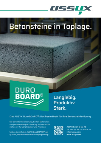Langlebig. Produktiv. Stark.Das ASSYX DuroBOARD%u00ae: Das beste Brett f%u00fcr Ihre Betonsteinfertigung.Betonsteine in Toplage.ASSYX GmbH & Co. KGTel. +49 (0) 26 32 - 94 75 10info@assyx.comwww.assyx.comMit perfekter Verarbeitung, besten Materialien und jahrzehntelanger Erfahrung aus der Praxis stehen wir f%u00fcr Langlebigkeit und Pr%u00e4zision.Setzen Sie mit dem ASSYX DuroBOARD%u00ae auf Qualit%u00e4t, die Ihre Produktion in Toplage bringt.
