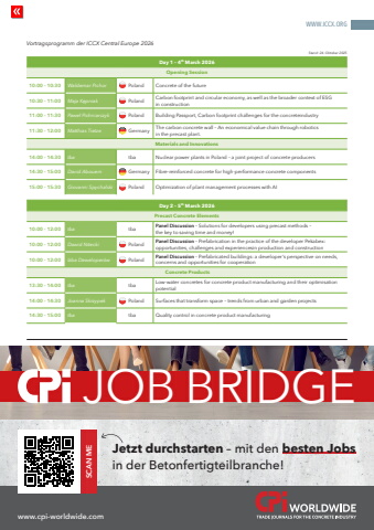 WWW.ICCX.ORGwww.cpi-worldwide.com BWI %u2013 BetonWerk International %u2013 6 | 2025 9Day 1 %u2013 4th March 2026Opening Session10:00 - 10:30 Waldemar Pichor Poland Concrete of the future10:30 - 11:00 Maja K%u0119pniak Poland Carbon footprint and circular economy, as well as the broader context of ESG in construction11:00 - 11:30 Pawe%u0142 Pichniarczyk Poland Building Passport, Carbon footprint challenges for the concreteindustry11:30 - 12:00 Matthias Tietze Germany The carbon concrete wall %u2013 An economical value chain through robotics in the precast plant.Materials and Innovations14:00 - 14:30 tba tba Nuclear power plants in Poland %u2013 a joint project of concrete producers14:30 - 15:00 David Abouem Germany Fibre-reinforced concrete for high-performance concrete components15:00 - 15:30 Giovanni Spychalski Poland Optimization of plant management processes with AIDay 2 %u2013 5th March 2026Precast Concrete Elements10:00 - 12:00 tba tba Panel Discussion %u2013 Solutions for developers using precast methods %u2013 the key to saving time and money!10:00 - 12:00 Dawid Nitecki Poland Panel Discussion %u2013 Prefabrication in the practice of the developer Pekabex: opportunities, challenges and experiencesin production and construction10:00 - 12:00 Izba Deweloper%u00f3w Poland Panel Discussion %u2013 Prefabricated buildings: a developer%u2018s perspective on needs, concerns and opportunities for cooperation Concrete Products13:30 - 14:00 tba tba Low-water concretes for concrete product manufacturing and their optimisation potential14:00 - 14:30 Joanna Skrzypek Poland Surfaces that transform space %u2013 trends from urban and garden projects14:30 - 15:00 tba tba Quality control in concrete product manufacturingVortragsprogramm der ICCX Central Europe 2026Stand: 24. Oktober 2025www.cpi-worldwide.comSCAN MEJetzt durchstarten %u2013 mit den besten Jobs in der Betonfertigteilbranche!JOB BRIDGE