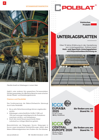 BETONWAREN/BETONWERKSTEINwww.cpi-worldwide.com BWI %u2013 BetonWerk International %u2013 6 | 2025t%u00e4glich, unter anderem fein gewaschene Terrassenplatten, Dachterrassenplatten f%u00fcr %u00f6ffentliche Bereiche sowie verschiedenste Pflaster- und Gestaltungselemente.Pr%u00e4zision und Flexibilit%u00e4tDas Funktionsprinzip der Rekers-Drehweiche %u00fcberzeugt durch hohe Flexibilit%u00e4t:%u2022 Bis zu zehn Fahrschienenstr%u00e4nge k%u00f6nnen angebunden werden.%u2022 K%u00fcbelwagen unterschiedlicher Gr%u00f6%u00dfe (1.500 und 750 Liter) versorgen bedarfsgerecht die Produktionsmaschinen mit Kern- und Vorsatzbeton.%u2022 Durch die smarte Steuerung wird jeder K%u00fcbel individuell zur richtigen Maschine geleitet.Besonderheiten wie Steigungen, Kurven, Steigungen in Kurven sowie komplizierte Streckenf%u00fchrungen stellen dank Rekers-Differentialgetrieben kein Problem dar. Die K%u00fcbelwaFlexible Anzahl an K%u00fcbelwagen in einem Netz%u00dcber 15 Jahre Erfahrung in der Herstellungvon Unterlagsplatten. Polblat bietetHolz- und Sperrholz-Unterlagsplattenmit Polyurethanbeschichtung anSie finden uns amStand Nr. 75Sie finden uns amStand Nr. 25UNTERLAGSPLATTENPolnischesProdukt