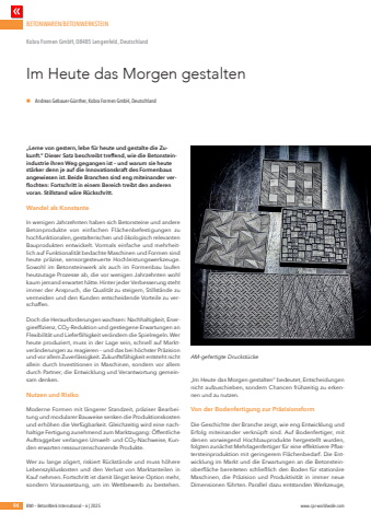 BETONWAREN/BETONWERKSTEIN94 BWI %u2013 BetonWerk International %u2013 6 | 2025 www.cpi-worldwide.com%u201eLerne von gestern, lebe f%u00fcr heute und gestalte die Zukunft.%u201c Dieser Satz beschreibt treffend, wie die Betonsteinindustrie ihren Weg gegangen ist %u2013 und warum sie heute st%u00e4rker denn je auf die Innovationskraft des Formenbaus angewiesen ist. Beide Branchen sind eng miteinander verflochten: Fortschritt in einem Bereich treibt den anderen voran. Stillstand w%u00e4re R%u00fcckschritt.Wandel als KonstanteIn wenigen Jahrzehnten haben sich Betonsteine und andere Betonprodukte von einfachen Fl%u00e4chenbefestigungen zu hochfunktionalen, gestalterischen und %u00f6kologisch relevanten Bauprodukten entwickelt. Vormals einfache und mehrheitlich auf Funktionalit%u00e4t bedachte Maschinen und Formen sind heute pr%u00e4zise, sensorgesteuerte Hochleistungswerkzeuge. Sowohl im Betonsteinwerk als auch im Formenbau laufen heutzutage Prozesse ab, die vor wenigen Jahrzehnten wohl kaum jemand erwartet h%u00e4tte. Hinter jeder Verbesserung steht immer der Anspruch, die Qualit%u00e4t zu steigern, Stillst%u00e4nde zu vermeiden und den Kunden entscheidende Vorteile zu verschaffen.Doch die Herausforderungen wachsen: Nachhaltigkeit, Energieeffizienz, CO2-Reduktion und gestiegene Erwartungen an Flexibilit%u00e4t und Lieferf%u00e4higkeit ver%u00e4ndern die Spielregeln. Wer heute produziert, muss in der Lage sein, schnell auf Marktver%u00e4nderungen zu reagieren %u2013 und das bei h%u00f6chster Pr%u00e4zision und vor allem Zuverl%u00e4ssigkeit. Zukunftsf%u00e4higkeit entsteht nicht allein durch Investitionen in Maschinen, sondern vor allem durch Partner, die Entwicklung und Verantwortung gemeinsam denken. Nutzen und RisikoModerne Formen mit l%u00e4ngerer Standzeit, pr%u00e4ziser Bearbeitung und modularer Bauweise senken die Produktionskosten und erh%u00f6hen die Verf%u00fcgbarkeit. Gleichzeitig wird eine nachhaltige Fertigung zunehmend zum Marktzugang: %u00d6ffentliche Auftraggeber verlangen Umwelt- und CO2-Nachweise, Kunden erwarten ressourcenschonende Produkte.Wer zu lange z%u00f6gert, riskiert R%u00fcckst%u00e4nde und muss h%u00f6here Lebenszykluskosten und den Verlust von Marktanteilen in Kauf nehmen. Fortschritt ist damit l%u00e4ngst keine Option mehr, sondern Voraussetzung, um im Wettbewerb zu bestehen. %u201eIm Heute das Morgen gestalten%u201c bedeutet, Entscheidungen nicht aufzuschieben, sondern Chancen fr%u00fchzeitig zu erkennen und zu nutzen. Von der Bodenfertigung zur Pr%u00e4zisionsformDie Geschichte der Branche zeigt, wie eng Entwicklung und Erfolg miteinander verkn%u00fcpft sind. Auf Bodenfertiger, mit denen vorwiegend Hochbauprodukte hergestellt wurden, folgten zun%u00e4chst Mehrlagenfertiger f%u00fcr eine effektivere Pflastersteinproduktion mit geringerem Fl%u00e4chenbedarf. Die Entwicklung im Markt und die Erwartungen an die Betonsteinoberfl%u00e4che bereiteten schlie%u00dflich den Boden f%u00fcr station%u00e4re Maschinen, die Pr%u00e4zision und Produktivit%u00e4t in immer neue Dimensionen f%u00fchrten. Parallel dazu entstanden Werkzeuge, Im Heute das Morgen gestalten Kobra Formen GmbH, 08485 Lengenfeld, Deutschland n Andreas Gebauer-G%u00fcnther, Kobra Formen GmbH, DeutschlandAM-gefertigte Druckst%u00fccke