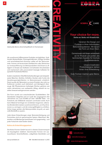 BETONWAREN/BETONWERKSTEINwww.cpi-worldwide.com BWI %u2013 BetonWerk International %u2013 6 | 2025die zunehmend differenzierte Produkte erm%u00f6glichten: funktionale Abstandhalter, Drainagefunktionen, farbige Vors%u00e4tze und verschiebesichere Konturen selbst auf der Steinunterseite. Formen mit konturierten Ziehblechen oder Ziehrechen zur Innenprofilierung von Betonprodukten sind heute so allt%u00e4glich im Einsatz wie Auflasten mit beheizten Druckst%u00fccken und mechanisch oder pneumatisch bewegte Auflasten f%u00fcr spezielle Produktoberfl%u00e4chen. Zudem erweiterten Oberfl%u00e4chenbehandlungen wie beispielsweise Waschen, Strahlen, Schleifen, Stocken oder Curlen die Gestaltungsm%u00f6glichkeiten im Betonsteinwerk erheblich. Damit wurde der Betonstein zu einem Produkt, das nicht nur funktional, sondern auch %u00e4sthetisch und %u00f6kologisch %u00fcberzeugt. Mit Pflastersteinen befestigte Fl%u00e4chen geh%u00f6ren seit vielen Jahrzehnten zum weltweiten Alltag, obwohl sie nur selten bewusst wahrgenommen werden. Die Form wurde zum entscheidenden Qualit%u00e4tsfaktor. Die Standzeiten steigerten sich im Laufe der vergangenen drei Jahrzehnte von rund 35.000 auf %u00fcber 100.000 Takte %u2013 ein Fortschritt, der Stillst%u00e4nde reduziert und Kosten senkt. Auch beim Material hat l%u00e4ngst ein Umdenken begonnen: alternative Bindemittel ersetzen zunehmend Zement, um CO2-Emissionen zu verringern und die Leistungsf%u00e4higkeit zu erh%u00f6hen. Schon lange werden alte Betonprodukte recycelt, um wertvolle Rohstoffe zu sparen.Jede dieser Entwicklungen zeigt: Betonsteinfertigung und Formenbau sind ein gemeinsames System. Maschinen, Materialien und Werkzeuge beeinflussen sich gegenseitig %u2013 und jeder Fortschritt n%u00fctzt beiden Seiten. Kobra als EntwicklungspartnerDie Kobra Formen GmbH hat sich in diesem Zusammenspiel als Impulsgeber etabliert. Geschraubte Formen mit austauschbaren Verschlei%u00dfteilen, vollgefr%u00e4ste Steinfelder und Gedruckte Kerne ohne Schwei%u00dfnaht im FormeinsatzFind us atCREATIVITYwww.kobragroup.comkobraformengroupkobraformenYour choice for more.Seite an Seite mit Kreativit%u00e4t.Vereinen Sie Design und Funktion in Ihren individuellen Betonsteinsystemen. Wir bauen die Form um Ihren Stein.Gemeinsam mit Ihnen entwickeln wir Ihr Produkt und pr%u00fcfen alle technischen Aspekte f%u00fcr h%u00f6chste Qualit%u00e4tstandards.Unsere kreativsten Produktdesigner stehen hinter Ihrer Entwicklung.Gute Formen machen gute Steine.