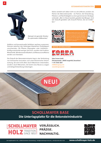 BETONWAREN/BETONWERKSTEINwww.cpi-worldwide.com BWI %u2013 BetonWerk International %u2013 6 | 2025 99Additive und konventionelle Verfahren wachsen zusammen, Grenzen zwischen den bisherigen klassischen Produkttypen verschwinden. Ob Pflaster, Rasengitter oder Hohlblock %u2013 k%u00fcnftig entscheidet weniger die Form, sondern die Funktion. Modularit%u00e4t, Wiederverwendbarkeit und Ressourceneffizienz werden zum Standard.Die Zukunft der Betonsteinindustrie liegt in der Verbindung von technischer Innovation und unternehmerischer Verantwortung. Sie wird nicht allein durch Maschinen entschieden, sondern durch Menschen, die bereit sind, Neues zu wagen und stetige Entwicklung mitzutragen.Kobra versteht sich dabei nicht nur als Lieferant, sondern als Partner der Betonsteinwerke %u2013 ein Partner, der Entwicklung, Pr%u00e4zision und Nachhaltigkeit zu einer gemeinsamen Strategie verbindet. %u201eWer im Heute handelt, gestaltet das Morgen. Und wer Zukunft gestalten will, braucht Partner, die sie mitdenken.%u201c nWEITERE INFORMATIONENKobra Formen GmbH Plohnbachstra%u00dfe 1, 08485 Lengenfeld, Deutschland T +49 37606 3020 info@kobragroup.com www.kobragroup.comTOOLS. Driven by knowledge. CARE. Powered by experience.Kobra erm%u00f6glicht allen Lesern der BWI den kostenlosen Download dieses Artikels im pdf-Format. Besuchen Sie die Webseite www.cpi-worldwide.com/channels/kobra oder scannen Sie den QR-Code mit Ihrem Smartphone ein, um direkt auf diese Webseite zu gelangen.Stempel mit geroider Struktur f%u00fcr optimierten Kr%u00e4fteverlaufSCHOLLMAYER BASE Die Unterlagsplatte f%u00fcr die BetonsteinindustrieAm Kupferwerk 2-10 | 65462 Ginsheim-Gustavsburg | info@schollmayer-holz.de | +49 (0) 6134-28 57 28VERL%u00c4SSLICH. PR%u00c4ZISE.NACHHALTIG.TRADITIONSCHOLLMAYERHOLZ SINCE 1853www.schollmayer-holz.deNEU!