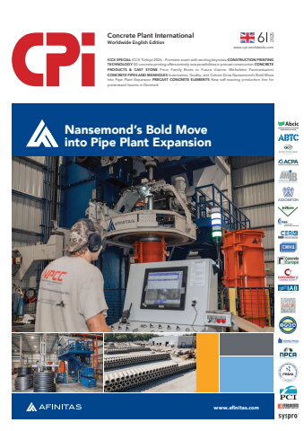 6www.cpi-worldwide.com2025Concrete Plant InternationalWorldwide English EditionICCX SPECIAL ICCX T%u00fcrkiye 2026 %u2013 Premiere event with exciting keynotes CONSTRUCTION PRINTING TECHNOLOGY 3D concrete printing offers entirely new possibilities in precast construction CONCRETE PRODUCTS & CAST STONE From Family Roots to Future Visions: Micheletto Pavimentazioni CONCRETE PIPES AND MANHOLES Automation, Quality, and Culture Drive Nansemond%u00b4s Bold Move into Pipe Plant Expansion PRECAST CONCRETE ELEMENTS New self-reacting production line for prestressed beams in Denmark Nansemond%u2019s Bold Move into Pipe Plant Expansionwww.afinitas.com