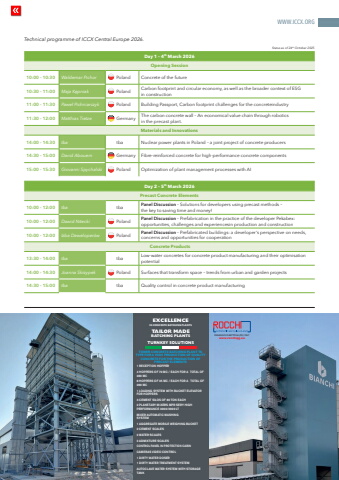 WWW.ICCX.ORGwww.cpi-worldwide.com CPI %u2013 Concrete Plant International %u2013 6 | 2025 11Day 1 %u2013 4th March 2026Opening Session10:00 - 10:30 Waldemar Pichor Poland Concrete of the future10:30 - 11:00 Maja K%u0119pniak Poland Carbon footprint and circular economy, as well as the broader context of ESG in construction11:00 - 11:30 Pawe%u0142 Pichniarczyk Poland Building Passport, Carbon footprint challenges for the concreteindustry11:30 - 12:00 Matthias Tietze Germany The carbon concrete wall %u2013 An economical value chain through robotics in the precast plant.Materials and Innovations14:00 - 14:30 tba tba Nuclear power plants in Poland %u2013 a joint project of concrete producers14:30 - 15:00 David Abouem Germany Fibre-reinforced concrete for high-performance concrete components15:00 - 15:30 Giovanni Spychalski Poland Optimization of plant management processes with AIDay 2 %u2013 5th March 2026Precast Concrete Elements10:00 - 12:00 tba tba Panel Discussion %u2013 Solutions for developers using precast methods %u2013 the key to saving time and money!10:00 - 12:00 Dawid Nitecki Poland Panel Discussion %u2013 Prefabrication in the practice of the developer Pekabex: opportunities, challenges and experiencesin production and construction10:00 - 12:00 Izba Deweloper%u00f3w Poland Panel Discussion %u2013 Prefabricated buildings: a developer%u2018s perspective on needs, concerns and opportunities for cooperation Concrete Products13:30 - 14:00 tba tba Low-water concretes for concrete product manufacturing and their optimisation potential14:00 - 14:30 Joanna Skrzypek Poland Surfaces that transform space %u2013 trends from urban and garden projects14:30 - 15:00 tba tba Quality control in concrete product manufacturingTechnical programme of ICCX Central Europe 2026.Status as of 24th October 20251 RECEPTION HOPPER4 HOPPERS OF 70 MC / EACH FOR A TOTAL OF 280 MC8 HOPPERS OF 35 MC / EACH FOR A TOTAL OF 280 MC1 LOADING SYSTEM WITH BUCKET ELEVATOR FOR HOPPERS3 CEMENT SILOS OF 80 TON EACH2 PLANETARY MIXERS MPR SERY HIGH PERFORMANCE 3000/2000 LTMIXER AUTOMATIC WASHING SYSTEM1 AGGREGATE MOBILE WEIGHING BUCKET2 CEMENT SCALES2 WATER SCALES2 ADMIXTURE SCALESCONTROL PANEL IN PROTECTION CABINCAMERAS VIDEO CONTROL1 DIRTY WATER DOSER1 DIRTY WATER TREATMENT SYSTEMAUTOCLAVE WATER SYSTEM WITH STORAGE TANKEXCELLENCEIN CONCRETE BATCHING PLANTSTAILOR MADEBATCHING PLANTSTURNKEY SOLUTIONSwww.rocchipg.euCMYCMMYCY CMYKRocchi logo allargato.pdf 1 11/03/19 17:24PASSAGGIO DI BETTONA (PG) ITALYTOWER CONCRETE BATCHING PLANT TK TYPE FOR A HIGH PRODUCTION OF QUALITY CONCRETE FOR THE PRODUCTION OF PRECAST ELEMENTS