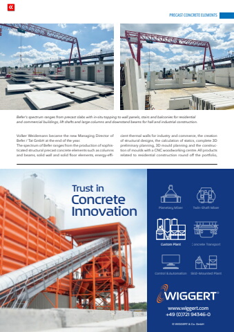 PRECAST CONCRETE ELEMENTSwww.cpi-worldwide.com CPI %u2013 Concrete Plant International %u2013 6 | 2025 133Volker Weidemann became the new Managing Director of Befer / Tat GmbH at the end of the year.The spectrum of Befer ranges from the production of sophisticated structural precast concrete elements such as columns and beams, solid wall and solid floor elements, energy-efficient thermal walls for industry and commerce, the creation of structural designs, the calculation of statics, complete 3D preliminary planning, 3D mould planning and the construction of moulds with a CNC woodworking centre. All products related to residential construction round off the portfolio, Befer's spectrum ranges from precast slabs with in-situ topping to wall panels, stairs and balconies for residential and commercial buildings, lift shafts and large columns and downstand beams for hall and industrial construction. Trust inConcrete Innovationwww.wiggert.com +49 (0)721 94346-0Planetary Mixer Twin-Shaft MixerCustom PlantControl & Automation Skid-Mounted PlantConcrete Transport%u00a9 WIGGERT & Co. GmbH