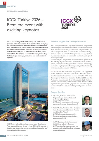 ICCX SPECIAL14 CPI %u2013 Concrete Plant International %u2013 6 | 2025 www.cpi-worldwide.comOn 13 and 14 May 2026, ICCX T%u00fcrkiye will celebrate its premiere at the Renaissance Polat Istanbul Hotel - bringing the successful format of the International Concrete Conference & Exhibition to T%u00fcrkiye for the first time. With Istanbul, a location was chosen that combines tradition, innovation and internationality like no other. The event offers professionals from the concrete and precast industry a new stage for knowledge exchange, innovation and business development.Specialist congress with a clear practical focusICCX T%u00fcrkiye combines a top-class conference programme with a comprehensive trade exhibition. Over two conference days, international and regional experts will present the latest developments from all areas of the concrete industry - from innovative concrete technologies and new approaches in precast construction to sustainable and earthquake-proof building concepts.Thematically, the programme covers the entire spectrum of the industry. A particular focus is on the topics of prefabrication, automation and digitalisation, which are increasingly seen as the key to greater efficiency, quality and sustainability in the construction industry in T%u00fcrkiye. The event and the conference programme are supported by fib - F%u00e9d%u00e9ration International du B%u00e9ton. fib is the international association for concrete and was formed in 1998 from the merger of the Comit%u00e9 Europ%u00e9en du B%u00e9ton (CEB) and the F%u00e9d%u00e9ration Internationale de la Pr%u00e9contrainte (fip), the international association for prestressed concrete. The association organises congresses and symposia and publishes reports and bulletins. Some lectures will be given by active fib members.Keynote Speeches%u2022 Alper Ilki, Professor of Structural Engineering at Istanbul Technical University (ITU), T%u00fcrkiye WT: Seismic construction with precast concrete elements %u2013 lessons learned%u2022 Robert Turksi, President of the European Autoclaved Aerated Concrete Association (EAACA), PolandWT: Challenges and opportunities for tomorrow%u2018s construction industry %u2013 advantages of AAC%u2022 Arif Al-Swaidani, Senior Researcher - IAB Weimar gGmbH, Germany WT: Potential of precast concrete construction with rebuilding Syria infrastructure and housingICCX T%u00fcrkiye 2026 %u2013 Premiere event with exciting keynotes13%u201314 May 2026, Istanbul, T%u00fcrkiyeT%u00dcRKIYE2026ICCX T%u00fcrkiye will celebrate its premiere at the Renaissance Polat Istanbul Hotel on 13 and 14 May 2026. With Istanbul, a location was chosen that combines tradition, innovation and internationality like no other.