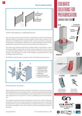 PRECAST CONCRETE ELEMENTSwww.cpi-worldwide.com CPI %u2013 Concrete Plant International %u2013 6 | 2025One of the key issues remains the lack of comprehensive studies evaluating the strength, stiffness, and ductility of support systems under seismic loading. To address this need, Edilmatic has conducted both numerical simulations and experimental tests on the MT system, with the aim of providing designers with technical guidance that meets project requirements and performance expectations.One of the main problems is the lack of in-depth studies on the behavior, in terms of strength, stiffness and ductility, of support systems subjected to seismic actions. To meet these needs, Edilmatic has carried out both numerical and experimental analyses on the MT system, in order to offer designers a guideline that can meet the design needs of the client.The Edilmatic support system analyzed consists of the following components:A three-dimensional finite element model was developed, incorporating a portion of the cladding panel, a portion of the column, and the complete support assembly. The model used more than 12,000 eight-node tetrahedral elements, with element sizes ranging from 5 mm to 50 mm, to ensure a detailed and accurate representation.The analysis considered material nonlinearity as well as the contact interactions between the panel and the support system. A rotating smeared crack approach was adopted to evaluate concrete damage, particularly in the regions surrounding the dowels embedded in the column and around the load distribution plate on the panel.MT bracket system components Position of the claddings in a prefabricated structure1 - Steel plate with two pins integral with the pilar2 - Load distribution plate, integral with the panel3 - Metal bracket4 - Adjustment bolt and nut5 - Fixing bolts for load transferRecovery accessory for fixing and plumbing the Pillar in the FoundationAccessory to be put in place in the Pillar for fixing the EFT AngleEFT SQUAREEFT SQUAREThe EFT system is supplied complete with counterplaques plates and fixing boltsCLAMPED PLATEPILLAR Also available with a system for rebar continuity.Bar with Sleeve (column side)FOUNDATIONe e)Threaded bar (foundation side)EDILMATIC SOLUTIONS FOR PREFABRICATIONTEMPORARY FIXING SYSTEM EFTACCREDITATOINSERTI QUALITA%u2019REDILMATIC S.P.A. Pegognaga (MN) - Italia www.edilmatic.itANNIVERSARY