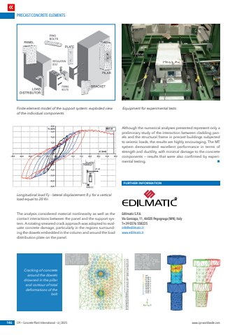 PRECAST CONCRETE ELEMENTS146 CPI %u2013 Concrete Plant International %u2013 6 | 2025 www.cpi-worldwide.comThe analysis considered material nonlinearity as well as the contact interactions between the panel and the support system. A rotating smeared crack approach was adopted to evaluate concrete damage, particularly in the regions surrounding the dowels embedded in the column and around the load distribution plate on the panel.Although the numerical analyses presented represent only a preliminary study of the interaction between cladding panels and the structural frame in precast buildings subjected to seismic loads, the results are highly encouraging. The MT system demonstrated excellent performance in terms of strength and ductility, with minimal damage to the concrete components %u2014 results that were also confirmed by experimental testing. nFURTHER INFORMATIONEdilmatic S.P.A.Via Gonzaga, 11, 46020 Pegognaga (MN), ItalyT+39 0376 558225 info@edilmatic.it www.edilmatic.itRFinite element model of the support system: exploded view of the individual components Equipment for experimental testsCracking of concrete around the dowels drowned in the pillar and contour of total deformations of the boltLongitudinal load Fy - lateral displacement %u03b4 y for a vertical load equal to 20 Kn
