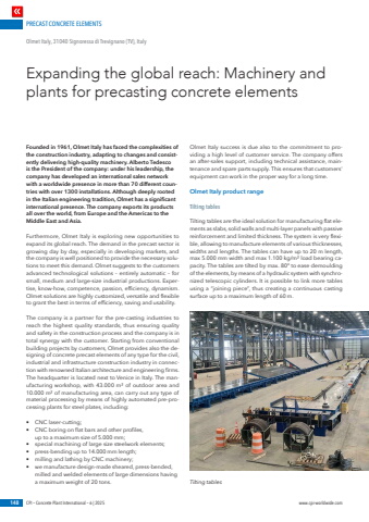 PRECAST CONCRETE ELEMENTS148 CPI %u2013 Concrete Plant International %u2013 6 | 2025 www.cpi-worldwide.comFounded in 1961, Olmet Italy has faced the complexities of the construction industry, adapting to changes and consistently delivering high-quality machinery. Alberto Tedesco is the President of the company: under his leadership, the company has developed an international sales network with a worldwide presence in more than 70 different countries with over 1300 installations. Although deeply rooted in the Italian engineering tradition, Olmet has a significant international presence. The company exports its products all over the world, from Europe and the Americas to the Middle East and Asia.Furthermore, Olmet Italy is exploring new opportunities to expand its global reach. The demand in the precast sector is growing day by day, especially in developing markets, and the company is well positioned to provide the necessary solutions to meet this demand. Olmet suggests to the customers advanced technological solutions %u2013 entirely automatic %u2013 for small, medium and large-size industrial productions. Expertise, know-how, competence, passion, efficiency, dynamism. Olmet solutions are highly customized, versatile and flexible to grant the best in terms of efficiency, saving and usability.The company is a partner for the pre-casting industries to reach the highest quality standards, thus ensuring quality and safety in the construction process and the company is in total synergy with the customer. Starting from conventional building projects by customers, Olmet provides also the designing of concrete precast elements of any type for the civil, industrial and infrastructure construction industry in connection with renowned Italian architecture and engineering firms.The headquarter is located next to Venice in Italy. The manufacturing workshop, with 43.000 m%u00b2 of outdoor area and 10.000 m%u00b2 of manufacturing area, can carry out any type of material processing by means of highly automated pre-processing plants for steel plates, including:%u2022 CNC laser-cutting;%u2022 CNC boring on flat bars and other profiles, up to a maximum size of 5.000 mm;%u2022 special machining of large size steelwork elements;%u2022 press-bending up to 14.000 mm length;%u2022 milling and lathing by CNC machinery;%u2022 we manufacture design-made sheared, press-bended, milled and welded elements of large dimensions having a maximum weight of 20 tons.Olmet Italy success is due also to the commitment to providing a high level of customer service. The company offers an after-sales support, including technical assistance, maintenance and spare parts supply. This ensures that customers' equipment can work in the proper way for a long time.Olmet Italy product rangeTilting tablesTilting tables are the ideal solution for manufacturing flat elements as slabs, solid walls and multi-layer panels with passive reinforcement and limited thickness. The system is very flexible, allowing to manufacture elements of various thicknesses, widths and lengths. The tables can have up to 20 m length, max 5.000 mm width and max 1.100 kg/m%u00b2 load bearing capacity. The tables are tilted by max. 80%u00b0 to ease demoulding of the elements, by means of a hydraulic system with synchronized telescopic cylinders. It is possible to link more tables using a %u201cjoining piece%u201d, thus creating a continuous casting surface up to a maximum length of 60 m.Expanding the global reach: Machinery and plants for precasting concrete elementsOlmet Italy, 31040 Signoressa di Trevignano (TV), ItalyTilting tables