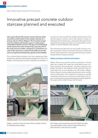PRECAST CONCRETE ELEMENTS154 CPI %u2013 Concrete Plant International %u2013 6 | 2025 www.cpi-worldwide.comLike a green thread, this precast concrete staircase winds around the central column of the outdoor staircase of a primary school in Ghent, Belgium. The innovative escape route for students and teachers is part of a pilot project using alkali-activated concrete. This type of concrete significantly reduces the carbon footprint by using only 25% of the usual amount of clinker compared to conventional concrete. At the same time, it retains the benefits of concrete, such as exceptional load-bearing capacity and formability.The architects Back Architects and the engineering office Studiebureau Mouton developed the design for Furnibo. The Belgian company Enjoy Concrete creativity and aesthetics in its work and and provided the prefabricated elements. The %u201eDe Zonnepoort%u201c primary school also posed a number of challenges for the design team, particularly with regard to the advanced technology used in the more sustainable concrete and the necessary stability of the staircase.The individual stair elements are very slender and have complex connections. These connections had to be invisible and smooth. At the same time, it was important that they could be disassembled as easily as possible.Allplan provides architectural freedomAllplan Precast was used for element production to break down the complex 3D model into producible precast concrete elements. Precast-specific concrete processes and phases, formwork, and transport of the elements were already taken into account. Based on the 3D model in Allplan Precast, Enjoy Concrete created all production plans and the entire reinforcement. This enabled the company to reliably coordinate reinforcement, anchoring, and formwork. The export of reinforcement quantity lists was particularly helpful for this project with variable stirrups and formwork.Innovative precast concrete outdoor staircase planned and executedAllplan Software Engineering GmbH, 5412 Puch, AustriaAllplan in practice: Enjoy Concrete relies on Allplan Precast for detailed precast design.Slim design and ecologically optimised: Alkali-activated concrete enables a lower carbon footprint thanks to a 25% reduction in the amount of clinker.%u00a9 Michiel Vergauwe Photography%u00a9 Michiel Vergauwe Photography