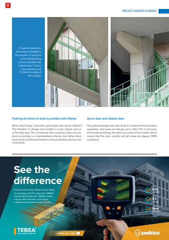 PRECAST CONCRETE ELEMENTSwww.cpi-worldwide.com CPI %u2013 Concrete Plant International %u2013 6 | 2025 155Pushing the limits of what is possible with AllplanWhat does Enjoy Concrete particularly like about Allplan? The freedom to design and model in a very simple and user-friendly way. This is because the company does not produce according to a standardized scheme, but rather transforms bold architectural dreams into producible precast concrete parts.Up-to-date and reliable dataThe precast design team also finds it convenient that all plans, quantities, and views are always up to date. This is because, technically speaking, the plans are views of the model, which means that the plan, model, and all views are always 100% consistent.13 special elements have been installed in this project: 4 columns (one load-bearing column divided into 4 elements), 7 stairs, 1 stair landing and 1 T-pillar to support the canopy.%u00a9 Michiel Vergauwe Photography %u00a9 Michiel Vergauwe Photographypeikko.comIncrease the energy efficiency and safety of a building with ETA approved TEBEA%u00ae Thermal Break Element. TEBEA%u00ae keeps a home safe and warm, and makes a difference that can be seen and felt.See the differenceETA assessedNon flammable markedThermal Break ElementTEBEA%u00ae