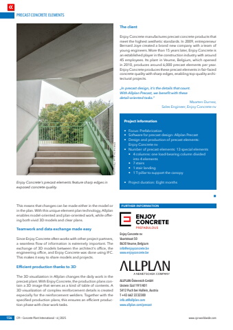 PRECAST CONCRETE ELEMENTS156 CPI %u2013 Concrete Plant International %u2013 6 | 2025 www.cpi-worldwide.comThis means that changes can be made either in the model or in the plan. With this unique element plan technology, Allplan enables model-oriented and plan-oriented work, while offering both vivid 3D models and clear plans.Teamwork and data exchange made easySince Enjoy Concrete often works with other project partners, a seamless flow of information is extremely important. The exchange of 3D models between the architect%u2018s office, the engineering office, and Enjoy Concrete was done using IFC. This makes it easy to share models and projects.Efficient production thanks to 3DThe 3D visualization in Allplan changes the daily work in the precast plant. With Enjoy Concrete, the production plans contain a 3D image that serves as a kind of table of contents. A 3D visualization of complex reinforcement details is created especially for the reinforcement welders. Together with the specified production plans, this ensures an efficient production phase with clear work tasks.The clientEnjoy Concrete manufactures precast concrete products that meet the highest aesthetic standards. In 2009, entrepreneur Bernard Joye created a brand new company with a team of young engineers. More than 15 years later, Enjoy Concrete is an established player in the construction industry with around 45 employees. Its plant in Veurne, Belgium, which opened in 2010, produces around 6,000 precast elements per year. Enjoy Concrete produces these precast elements in fair-faced concrete quality with sharp edges, enabling top-quality architectural projects.%u201eIn precast design, it%u2018s the details that count. With Allplan Precast, we benefit with these detail-oriented tasks.%u201c Maarten Durnez, Sales Engineer, Enjoy Concrete nv Project information%u2022 Focus: Prefabrication%u2022 Software for precast design: Allplan Precast%u2022 Design and production of precast elements: Enjoy Concrete nv%u2022 Number of precast elements: 13 special elements%u2022 4 columns: one load-bearing column divided into 4 elements%u2022 7 stairs%u2022 1 stair landing%u2022 1 T-pillar to support the canopy%u2022 Project duration: Eight monthsnFURTHER INFORMATIONEnjoy Concrete nvVaartstraat 508630 Veurne, Belgiuminfo@enjoyconcrete.bewww.enjoyconcrete.beALLPLAN %u00d6sterreich GmbHUrstein S%u00fcd 19/1/4015412 Puch bei Hallein, AustriaT +43 662 2232300info.at@allplan.comwww.allplan.com/precastEnjoy Concrete%u2018s precast elements feature sharp edges in exposed concrete quality.%u00a9 Michiel Vergauwe Photography