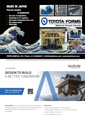 MADE IN JAPANPrecast moulds & equipment- 60 years of experience- Exporting to 27 countries- One-touch collapsible inner core - All custom-made- Watertight TOYOTA KOHKI CO., LTD. | Phone: +81 42(366)6011 | info@toyotaforms.com | www.toyotaforms.com2502_toyota_en.indd 1 15.02.25 17:11ALLPLAN 2026 continues to redefine productivity and collaboration for architects, engineers, fabricators, and construction professionals. The latest release focuses on automation, integration, and sustainability.Key benefits:> Faster creation of production-ready drawings> Quicker design of hollow core slabs for more sustainability> Easier handling of connections> Automated quantity take-offFIND OUT MORE NOW:allplan.com/allplan2026DESIGN TO BUILDA BETTER TOMORROW\\ ALLPLAN 2026%u00a9 Markus Kottersteger