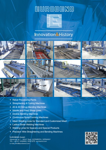 EUROBEND GmbHAlexander str. 1,%u00a0 90547 Stein, N%u00dcRNBERG, GERMANYTEL. +49 911 9498980, WEB SITE: eurobend.come-mail: info@eurobend.com%u2022 Rebar Processing Plants%u2022 Straightening & Cutting Machines%u2022 2D & 3D Stirrup Bending Machines%u2022 Mobile and Fixed Shear Lines%u2022 Double Bending Machines%u2022 Continuous Spiral Forming Machines%u2022 Mesh Welding Lines for Standard and Customized Mesh%u2022 Lattice Girder Welding Machines%u2022 Welding Lines for Spacers and Special Products%u2022 Precision Wire Straightening and Bending Machines