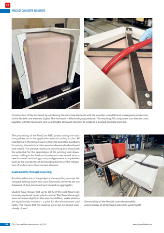 PRECAST CONCRETE ELEMENTS164 CPI %u2013 Concrete Plant International %u2013 6 | 2025 www.cpi-worldwide.comThe processing of the FlexCore R&D project along the solution path set out in the application went according to plan. All milestones in the project were achieved. Scientific questions for solving the technical risks were fundamentally developed and solved. The project results are promising and show both the potential for the application of 3D printing and downstream milling in the fresh and hardened state as well as for a new formwork technology to expand geometric complexities such as the avoidance of demoulding bevels or the integration of undercuts in the concrete element.Sustainability through recyclingAnother milestone of the project is the recycling concept developed. Milling waste and used formwork elements are not disposed of, but processed and reused as aggregates.Studies have shown that up to 50 % of the rock flours can be easily replaced by recycled material. The flexural strength even increases slightly in this area. In addition, waste streams are significantly reduced %u2013 a plus for the environment and costs. This means that the material cycle can be almost completely closed.Construction of the formwork by combining the concrete elements with the wooden core (left) and subsequent production of the flexible core element (right). The formwork is filled with polyurethane. The resulting PU component can then be used together with the formwork core as a flexible formwork element to produce a precast concrete element. Demoulding of the flexible core element (left) and overview of all formwork elements used (right)
