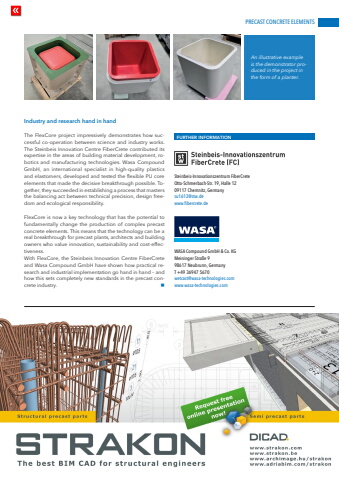 PRECAST CONCRETE ELEMENTSwww.cpi-worldwide.com CPI %u2013 Concrete Plant International %u2013 6 | 2025 165Industry and research hand in handThe FlexCore project impressively demonstrates how successful co-operation between science and industry works. The Steinbeis Innovation Centre FiberCrete contributed its expertise in the areas of building material development, robotics and manufacturing technologies. Wasa Compound GmbH, an international specialist in high-quality plastics and elastomers, developed and tested the flexible PU core elements that made the decisive breakthrough possible. Together, they succeeded in establishing a process that masters the balancing act between technical precision, design freedom and ecological responsibility.FlexCore is now a key technology that has the potential to fundamentally change the production of complex precast concrete elements. This means that the technology can be a real breakthrough for precast plants, architects and building owners who value innovation, sustainability and cost-effectiveness.With FlexCore, the Steinbeis Innovation Centre FiberCrete and Wasa Compound GmbH have shown how practical research and industrial implementation go hand in hand %u2013 and how this sets completely new standards in the precast concrete industry. nFURTHER INFORMATIONSteinbeis-Innovationszentrum FiberCreteOtto-Schmerbach-Str. 19, Halle 1209117 Chemnitz, Germanysu1612@stw.dewww.fibercrete.deWASA Compound GmbH & Co. KG Meininger Stra%u00dfe 9 98617 Neubrunn, Germany T +49 36947 5670 wetcast@wasa-technologies.com www.wasa-technologies.comAn illustrative example is the demonstrator produced in the project in the form of a planter.