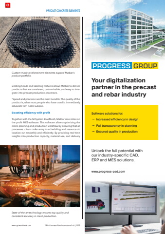 PRECAST CONCRETE ELEMENTSwww.cpi-worldwide.com CPI %u2013 Concrete Plant International %u2013 6 | 2025welding heads and labelling features allows Matbar to deliver products that are consistent, customizable, and easy to integrate into precast production processes.%u201cSpeed and precision are the main benefits. The quality of the product is, what most people who have used it, immediately advocate for,%u201d notes Gibson.Boosting efficiency with profitTogether with the M-System BlueMesh, Matbar also relies on the profit MES-software. This software allows optimizing the entire planning and production workflow by ensuring that all processes %u2013 from order entry to scheduling and resource allocation run smoothly and efficiently. By providing real-time insights into production capacity, material use, and delivery State-of-the-art technology ensures top quality and consistent accuracy in mesh production.Custom-made reinforcement elements expand Matbar%u2019s product portfolio.Your digitalizationpartner in the precast and rebar industryUnlock the full potential with our industry-specific CAD, ERP and MES solutions.Software solutions for: %u02db Increased efficiency in design%u02db Full transparency in planning%u02db Ensured quality in productionwww.progress-psd.com