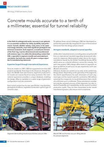 PRECAST CONCRETE ELEMENTS170 CPI %u2013 Concrete Plant International %u2013 6 | 2025 www.cpi-worldwide.comIn the field of underground works, accuracy is not optional: it is an essential condition for safety, durability and performance. Tunnels, whether railway, road, metro, or for water and energy networks, must meet significant geological and technical constraints. Each segment, a constituent element of the final ring, must be dimensioned and manufactured with extreme rigor. It is within this demanding context that CBE, a specialist in segment moulds and automated precast plants, has built over nearly 40 years a unique expertise in manufacturing tolerances.Expertise forged through International ExperienceSince its creation in 1987, CBE has supported more than 650 projects worldwide. From Asia to the Americas, through Europe, the Middle East and Oceania, segments produced in its moulds can now be found on every continent. This international experience provides a unique database, enabling the design office to capitalize on a wide range of geometric configurations and site constraints.Each tunnel project has its own specificities: ring diameter, geological conditions, expected construction speed, type of concrete used... To address these varied challenges, CBE has developed expertise that systematically integrates the issue of dimensional tolerances from the design phase onward.Stringent standards, adapted to tunnel specificsUnlike other industrial sectors, tunneling does not yet benefit from an international standard regarding dimensional tolerances for segments. Most projects today rely on the recommendations issued by the British Tunnelling Society (BTS), which serve as a shared reference across the industry. For each new project, CBE%u2019s design office bases its approach on these guidelines as well as on its own experience, built over 38 years of practice.Tolerance studies are carried out as early as the preliminary design phase. Depending on the geometry of the segments, the client%u2019s specifications for each dimension of each segment type and the tunnel%u2019s specific constraints, CBE defines extremely fine margins for its mould dimensions: from a tenth of a millimeter up to a millimeter. These calculations consider not only the required accuracy of the segments, but also industrial feasibility and repeatability across several hundred production cycles. They are then transmitted to the mould manufacturing teams, who ensure strict compliance.Concrete moulds accurate to a tenth of a millimeter, essential for tunnel reliabilityCBE Group, 37550 Saint Avertin, France Segment demoulding thanks to an Acimex vacuum lifter Mould CBE and Acimex vacuum lifting device for precast segments