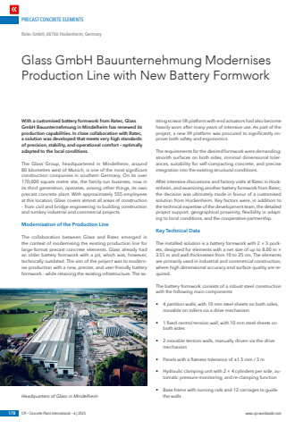 PRECAST CONCRETE ELEMENTS178 CPI %u2013 Concrete Plant International %u2013 6 | 2025 www.cpi-worldwide.comWith a customised battery formwork from Ratec, Glass GmbH Bauunternehmung in Mindelheim has renewed its production capabilities. In close collaboration with Ratec, a solution was developed that meets very high standards of precision, stability, and operational comfort %u2013 optimally adapted to the local conditions.The Glass Group, headquartered in Mindelheim, around 80 kilometres west of Munich, is one of the most significant construction companies in southern Germany. On its over 170,000 square metre site, the family-run business, now in its third generation, operates, among other things, its own precast concrete plant. With approximately 555 employees at this location, Glass covers almost all areas of construction %u2013 from civil and bridge engineering to building construction and turnkey industrial and commercial projects.Modernisation of the Production LineThe collaboration between Glass and Ratec emerged in the context of modernising the existing production line for large-format precast concrete elements. Glass already had an older battery formwork with a pit, which was, however, technically outdated. The aim of the project was to modernise production with a new, precise, and user-friendly battery formwork %u2013 while retaining the existing infrastructure. The existing scissor lift platform with end actuators had also become heavily worn after many years of intensive use. As part of the project, a new lift platform was procured to significantly improve both safety and ergonomics.The requirements for the desired formwork were demanding: smooth surfaces on both sides, minimal dimensional tolerances, suitability for self-compacting concrete, and precise integration into the existing structural conditions.After intensive discussions and factory visits at Ratec in Hockenheim, and examining another battery formwork from Ratec, the decision was ultimately made in favour of a customised solution from Hockenheim. Key factors were, in addition to the technical expertise of the development team, the detailed project support, geographical proximity, flexibility in adapting to local conditions, and the cooperative partnership.Key Technical DataThe installed solution is a battery formwork with 2 %u00d7 3 pockets, designed for elements with a net size of up to 8.00 m %u00d7 3.55 m and wall thicknesses from 10 to 25 cm. The elements are primarily used in industrial and commercial construction, where high dimensional accuracy and surface quality are required.The battery formwork consists of a robust steel construction with the following main components:%u2022 4 partition walls, with 10 mm steel sheets on both sides, movable on rollers via a drive mechanism%u2022 1 fixed central tension wall, with 10 mm steel sheets on both sides%u2022 2 movable tension walls, manually driven via the drive mechanism%u2022 Panels with a flatness tolerance of %u00b11.5 mm / 3 m%u2022 Hydraulic clamping unit with 2 %u00d7 4 cylinders per side, automatic pressure monitoring, and re-clamping function%u2022 Base frame with running rails and 12 carriages to guide the wallsGlass GmbH Bauunternehmung Modernises Production Line with New Battery Formwork Ratec GmbH, 68766 Hockenheim, Germany Headquarters of Glass in Mindelheim