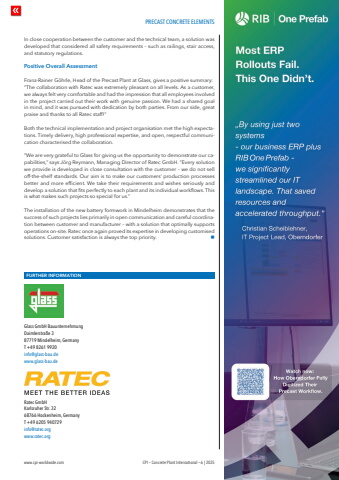 PRECAST CONCRETE ELEMENTSwww.cpi-worldwide.com CPI %u2013 Concrete Plant International %u2013 6 | 2025In close cooperation between the customer and the technical team, a solution was developed that considered all safety requirements %u2013 such as railings, stair access, and statutory regulations.Positive Overall AssessmentFranz-Rainer G%u00f6hrle, Head of the Precast Plant at Glass, gives a positive summary:%u201cThe collaboration with Ratec was extremely pleasant on all levels. As a customer, we always felt very comfortable and had the impression that all employees involved in the project carried out their work with genuine passion. We had a shared goal in mind, and it was pursued with dedication by both parties. From our side, great praise and thanks to all Ratec staff!%u201dBoth the technical implementation and project organisation met the high expectations. Timely delivery, high professional expertise, and open, respectful communication characterised the collaboration.%u201cWe are very grateful to Glass for giving us the opportunity to demonstrate our capabilities,%u201d says J%u00f6rg Reymann, Managing Director of Ratec GmbH. %u201cEvery solution we provide is developed in close consultation with the customer %u2013 we do not sell off-the-shelf standards. Our aim is to make our customers%u2019 production processes better and more efficient. We take their requirements and wishes seriously and develop a solution that fits perfectly to each plant and its individual workflows. This is what makes such projects so special for us.%u201dThe installation of the new battery formwork in Mindelheim demonstrates that the success of such projects lies primarily in open communication and careful coordination between customer and manufacturer %u2013 with a solution that optimally supports operations on-site. Ratec once again proved its expertise in developing customised solutions. Customer satisfaction is always the top priority. nFURTHER INFORMATIONGlass GmbH Bauunternehmung Daimlerstra%u00dfe 387719 Mindelheim, GermanyT +49 8261 9920 info@glass-bau.dewww.glass-bau.deRatec GmbH Karlsruher Str. 3268766 Hockenheim, Germany T +49 6205 940729 info@ratec.org www.ratec.org