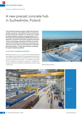 PRECAST CONCRETE ELEMENTS184 CPI %u2013 Concrete Plant International %u2013 6 | 2025 www.cpi-worldwide.comThe Industrial Development Agency (ARP) has launched a strategic investment in Suchedni%u00f3w, Poland, transforming the site of the former %u201cMarywil%u201d S.A. factory into a modern production facility for precast concrete elements. In just ten months from groundbreaking, ARP Budownictwo completed the construction of the plant, equipped it with stateof-the-art technology, and started production. Once fully operational, the facility will employ over 100 people and achieve an annual output of up to 400,000 m%u00b2 of wall and floor slab elements %u2014 a major step forward in revitalizing the region%u2019s industrial potential.A new era for residential constructionARP Budownictwo Sp. z o.o. is part of the Industrial Development Agency Group (ARP JSC) and specializes in the production of high-quality precast concrete elements. The company provides comprehensive services %u2014 from design and production to installation and general contracting %u2014 delivering innovative solutions for industrial, residential, and public utility construction.A new precast concrete hub in Suchedni%u00f3w, PolandMCT Italy srl, 06084 Bettona (PG), Italy ARP Factory overviewProduction facility