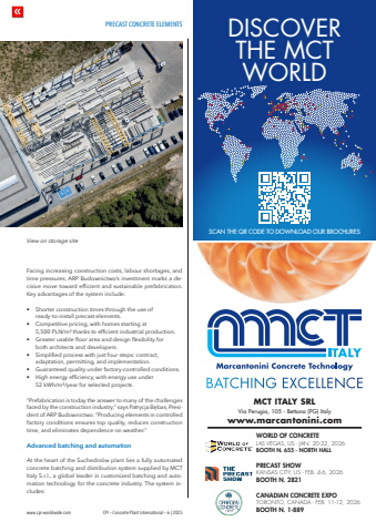 PRECAST CONCRETE ELEMENTSwww.cpi-worldwide.com CPI %u2013 Concrete Plant International %u2013 6 | 2025Facing increasing construction costs, labour shortages, and time pressures, ARP Budownictwo%u2019s investment marks a decisive move toward efficient and sustainable prefabrication. Key advantages of the system include:%u2022 Shorter construction times through the use of ready-to-install precast elements.%u2022 Competitive pricing, with homes starting at 5,500 PLN/m%u00b2 thanks to efficient industrial production.%u2022 Greater usable floor area and design flexibility for both architects and developers.%u2022 Simplified process with just four steps: contract, adaptation, permitting, and implementation.%u2022 Guaranteed quality under factory-controlled conditions.%u2022 High energy efficiency, with energy use under 52 kWh/m%u00b2/year for selected projects.%u201cPrefabrication is today the answer to many of the challenges faced by the construction industry,%u201d says Patrycja B%u0119bas, President of ARP Budownictwo. %u201cProducing elements in controlled factory conditions ensures top quality, reduces construction time, and eliminates dependence on weather.%u201dAdvanced batching and automationAt the heart of the Suchedni%u00f3w plant lies a fully automated concrete batching and distribution system supplied by MCT Italy S.r.l., a global leader in customized batching and automation technology for the concrete industry. The system includes:View on storage siteBATCHING EXCELLENCEMCT ITALY SRL Via Perugia, 105 - Bettona (PG) Italywww.marcantonini.comWORLD OF CONCRETELAS VEGAS, US - JAN. 20-22, 2026BOOTH N. 655 - NORTH HALLPRECAST SHOWKANSAS CITY, US - FEB. 4-6, 2026BOOTH N. 2821CANADIAN CONCRETE EXPOTORONTO, CANADA - FEB. 11-12, 2026BOOTH N. 1-889DISCOVER THE MCT WORLDSCAN THE QR CODE TO DOWNLOAD OUR BROCHURES