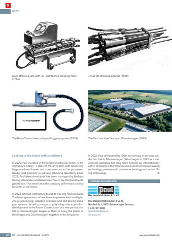 NEWS22 CPI %u2013 Concrete Plant International %u2013 6 | 2025 www.cpi-worldwide.comLooking to the future with confidenceIn 2020, Paul invested in the largest machining centre in the company's history - a state-of-the-art system with which very large machine frames and components can be processed flexibly and precisely in just one clamping operation. Since 2021, Paul Maschinenfabrik has been managed by Barbara Hering, Alexander and Maximilian Paul in the third and fourth generation. This means that the company will remain a family business in the future.In 2023, artificial intelligence found its way into Paul products. The latest generation of machines impresses with intelligent image processing, adaptive scanners and self-driving transport systems. AI will continue to play a key role in product development in the future. Construction of a new production hall in D%u00fcrmentingen began in 2024 to bring the plants in Riedlingen and D%u00fcrmentingen together in the long term.In 2025, Paul celebrated its 100th anniversary in the new production hall in D%u00fcrmentingen. What began in 1925 as a mechanical workshop has long since become an internationally active company in the three business areas of circular sawing technology, prestressed concrete technology and strand lifting technology. nMulti-stressing jack with 70 - 300 tonnes stressing force (1955)TinyTensaControl measuring and logging system (2019) The Paul machine factory in D%u00fcrmentingen (2025)Tensa SM stressing process (1960)FURTHER INFORMATIONPaul Maschinenfabrik GmbH & Co. KG Max-Paul-Str. 1, 88525 D%u00fcrmentingen, Germany T +49 7371 5000spannbeton@paul.euwww.paul.eu