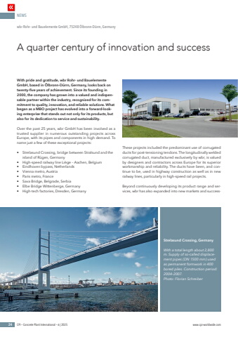NEWS24 CPI %u2013 Concrete Plant International %u2013 6 | 2025 www.cpi-worldwide.comWith pride and gratitude, wbr Rohr- und Bauelemente GmbH, based in %u00d6lbronn-D%u00fcrrn, Germany, looks back on twenty-five years of achievement. Since its founding in 2000, the company has grown into a valued and indispensable partner within the industry, recognized for its commitment to quality, innovation, and reliable solutions. What began as a MBO project has evolved into a forward-looking enterprise that stands out not only for its products, but also for its dedication to service and sustainability.Over the past 25 years, wbr GmbH has been involved as a trusted supplier in numerous outstanding projects across Europe, with its pipes and components in high demand. To name just a few of these exceptional projects:%u2022 Strelasund Crossing, bridge between Stralsund and the island of R%u00fcgen, Germany%u2022 High-speed railway line Li%u00e8ge %u2013 Aachen, Belgium%u2022 Eindhoven bypass, Netherlands%u2022 Vienna metro, Austria%u2022 Paris metro, France%u2022 Sava Bridge, Belgrade, Serbia%u2022 Elbe Bridge Wittenberge, Germany%u2022 High-tech factories, Dresden, GermanyThese projects included the predominant use of corrugated ducts for post-tensioning tendons. The longitudinally welded corrugated duct, manufactured exclusively by wbr, is valued by designers and contractors across Europe for its superior workmanship and reliability. The ducts have been, and continue to be, used in highway construction as well as in new railway lines, particularly in high-speed rail projects.Beyond continuously developing its product range and services, wbr has also expanded into new markets and successA quarter century of innovation and successwbr Rohr- und Bauelemente GmbH, 75248 %u00d6lbronn-D%u00fcrrn, GermanyStrelasund Crossing, Germany With a total length about 2,800 m. Supply of so-called displacement pipes (DN 1500 mm) used as permanent formwork in 400 bored piles. Construction period: 2004%u20132007. Photo: Florian Schreiber