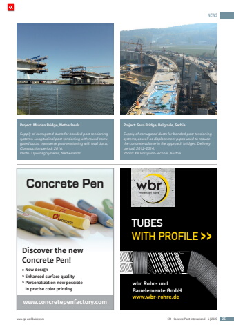 NEWSwww.cpi-worldwide.com CPI %u2013 Concrete Plant International %u2013 6 | 2025 25Project: Muiden Bridge, NetherlandsSupply of corrugated ducts for bonded post-tensioning systems. Longitudinal post-tensioning with round corrugated ducts; transverse post-tensioning with oval ducts. Construction period: 2016. Photo: Dywidag Systems, NetherlandsProject: Sava Bridge, Belgrade, SerbiaSupply of corrugated ducts for bonded post-tensioning systems, as well as displacement pipes used to reduce the concrete volume in the approach bridges. Delivery period: 2012%u20132014. Photo: KB Vorspann-Technik, Austria Discover the new Concrete Pen!%u00bb New design%u00bb Enhanced surface quality%u00bb Personalization now possible in precise color printingwww.concretepenfactory.comConcrete PenROHRE MIT PROFIL >>wbr Rohr- und Bauelemente GmbHwww.wbr-rohre.deWBR_AZ_210x149_RZ_20230728.indd 1 ROHRE MIT PROFIL >>ROHRE MIT PROFIL >>wbr Rohr- und Bauelemente GmbHwww.wbr-rohre.deWBR_AZ_210x149_RZ_20230728.indd 1 ROHRE MIT PROFIL >>wbr Rohr- und Bauelemente GmbHwww.wbr-rohre.deWBR_AZ_210x149_RZ_20230728.indd 1 28.07.23 13:13ROHRE MIT PROFIL >>wbr Rohr- und Bauelemente GmbHwww.wbr-rohre.deWBR_AZ_210x149_RZ_20230728.indd 1 TUBESWITH PROFILE