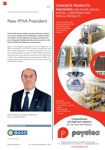 NEWSwww.cpi-worldwide.com CPI %u2013 Concrete Plant International %u2013 6 | 2025Marco Pecetti from Generale Prefabbricati is the new IPHA PresidentAt the 2025 Annual Conference held in Warsaw, Poland, it was announced that Seamus McKeague would step down as President of IPHA. Elected in his place was Marco Pecetti, of Generale Prefabbricati, Italy, who has served on the board of IPHA with distinction for many years.Marco is an Engineer, graduated from the Polytechnic of Milan, specialized in the field of project management and cost control. Registered in the National Register of Fire Protection Professionals. He worked in BNP Paribas Real Estate Italy before joining the family business Generale Prefabbricati in 2012 as General Manager with responsibility for R&D, commercial and technical activities. He holds various positions in Confindustria Umbria. nNew IPHA President International Prestressed Hollowcore AssociationFURTHER INFORMATIONwww.hollowcore.org