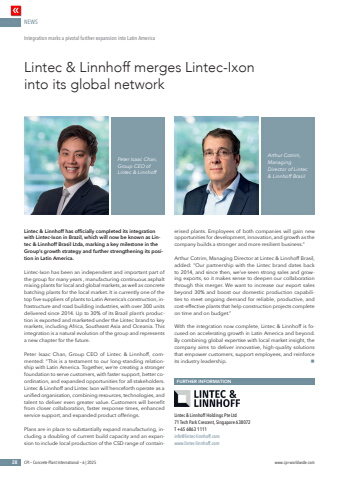 NEWS28 CPI %u2013 Concrete Plant International %u2013 6 | 2025 www.cpi-worldwide.comLintec & Linnhoff has officially completed its integration with Lintec-Ixon in Brazil, which will now be known as Lintec & Linnhoff Brasil Ltda, marking a key milestone in the Group%u2019s growth strategy and further strengthening its position in Latin America. Lintec-Ixon has been an independent and important part of the group for many years , manufacturing continuous asphalt mixing plants for local and global markets, as well as concrete batching plants for the local market. It is currently one of the top five suppliers of plants to Latin America%u2019s construction, infrastructure and road building industries, with over 300 units delivered since 2014. Up to 30% of its Brazil plant%u2019s production is exported and marketed under the Lintec brand to key markets, including Africa, Southeast Asia and Oceania. This integration is a natural evolution of the group and represents a new chapter for the future.Peter Isaac Chan, Group CEO of Lintec & Linnhoff, commented: %u201cThis is a testament to our long-standing relationship with Latin America. Together, we%u2019re creating a stronger foundation to serve customers, with faster support, better coordination, and expanded opportunities for all stakeholders. Lintec & Linnhoff and Lintec Ixon will henceforth operate as a unified organisation, combining resources, technologies, and talent to deliver even greater value. Customers will benefit from closer collaboration, faster response times, enhanced service support, and expanded product offerings. Plans are in place to substantially expand manufacturing, including a doubling of current build capacity and an expansion to include local production of the CSD range of containerised plants. Employees of both companies will gain new opportunities for development, innovation, and growth as the company builds a stronger and more resilient business.%u201dArthur Cotrim, Managing Director at Lintec & Linnhoff Brasil, added: %u201cOur partnership with the Lintec brand dates back to 2014, and since then, we%u2019ve seen strong sales and growing exports, so it makes sense to deepen our collaboration through this merger. We want to increase our export sales beyond 30% and boost our domestic production capabilities to meet ongoing demand for reliable, productive, and cost-effective plants that help construction projects complete on time and on budget.%u201dWith the integration now complete, Lintec & Linnhoff is focused on accelerating growth in Latin America and beyond. By combining global expertise with local market insight, the company aims to deliver innovative, high-quality solutions that empower customers, support employees, and reinforce its industry leadership. nLintec & Linnhoff merges Lintec-Ixon into its global networkIntegration marks a pivotal further expansion into Latin AmericaFURTHER INFORMATIONLintec & Linnhoff Holdings Pte Ltd 71 Tech Park Crescent, Singapore 638072 T +65 6863 1111 info@lintec-linnhoff.comwww.lintec-linnhoff.comPeter Isaac Chan, Group CEO of Lintec & Linnhoff Arthur Cotrim, Managing Director of Lintec & Linnhoff Brasil