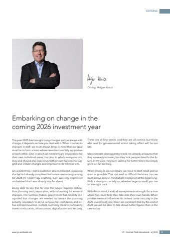 www.cpi-worldwide.com CPI %u2013 Concrete Plant International %u2013 6 | 2025 3EDITORIALThe year 2025 has brought many changes and, as always with change, it depends on how you deal with it. When it comes to changes in staff, we must always keep in mind that our goal must be to form a team whose members are fully supportive of each other. One in which all members are responsible for their own individual areas, but also in which everyone can, may and should also look beyond their own horizons to suggest and initiate changes and improvements there as well.On a recent trip, I met a customer who mentioned in passing that he had already completed his human-resources planning for 2028 (!). I didn%u2019t say anything, but I was very impressed and wished that I was already that far ahead. Being able to see that far into the future requires meticulous planning and preparation, without waiting for external changes. The German federal government has recently recognized that changes are needed to restore the planning security necessary to serve as basis for confidence and active entrepreneurship. In 2026, Germany plans to particularly invest in education, infrastructure, digitalization and security. These are all fine words, and they are all correct, but those who wait for governmental action taking effect will be too late.Many precast plant operators told me already at bauma that they are ready to invest, but they lack perspectives for the future. In my view, however, waiting for better times has simply gone on far too long.When changes are necessary, we have to start small and as soon as possible. This can lead to difficult decisions, but we must always keep in mind what I mentioned at the beginning: With a team you can rely on, whether large or small, you are on the right track. With this in mind, I wish all entrepreneurs strength for a time when they must take their fate into their own hands. When positive external influences do indeed come into play in the 2026 investment year, then I am confident that by the end of 2026 we will be able to talk about better figures than is the case today.Embarking on change in the coming 2026 investment yearDr.-Ing. Holger Karutz