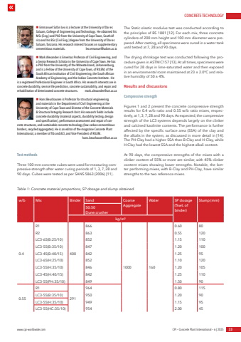 CONCRETE TECHNOLOGYwww.cpi-worldwide.com CPI %u2013 Concrete Plant International %u2013 6 | 2025 33Test methodsThree 100-mm concrete cubes were used for measuring compressive strength after water curing periods of 1, 3, 7, 28 and 90 days. Cubes were tested as per SANS 5863 (2006) [11]. The Static elastic modulus test was conducted according to the principles of BS 1881 [12]. For each mix, three concrete cylinders of 200 mm height and 100 mm diameter were prepared. After casting, all specimens were cured in a water tank until tested at 7, 28 and 90 days. The drying shrinkage test was conducted following the procedure given in ASTM C157 [13]. At all times, specimens were cured for 28 days in lime-saturated water and then exposed in an environmental room maintained at 23 %u00b1 2.0%u00b0C and relative humidity of 50 %u00b1 4%. Results and discussions Compressive strength Figures 1 and 2 present the concrete compressive strength results for 0.4 w/b ratio and 0.55 w/b ratio mixes, respectively, at 1, 3, 7, 28 and 90 days. As expected, the compressive strength of the LC3 systems depends largely on the clinker and calcined kaolinite contents. The performance is further affected by the specific surface area (SSA) of the clay and the alkalis in the system, as discussed in more detail in [14]. The PH-Clay had a higher SSA than B-Clay and H-Clay, while H-Clay had the lowest SSA and the highest alkali content.At 90 days, the compressive strengths of the mixes with a clinker content of 55% or more are similar, with 45% clinker content mixes showing lower strengths. Notable, the better performing mixes, with B-Clay and PH-Clay, have similar strengths to the two reference mixes. n Emmanuel Safari Leo is a lecturer at the University of Dar es Salaam, College of Engineering and Technology. He obtained his MSc (Eng.) and PhD from the University of Cape Town, South Africa and his BSc (Civil Eng.) degree from the University of Dar es Salaam, Tanzania. His research interest focuses on supplementary cementitious materials. leo.emanuel@udsm.ac.tz n Mark Alexander is Emeritus Professor of Civil Engineering, and a Senior Research Scholar in the University of Cape Town. He has a PhD from the University of the Witwatersrand, Johannesburg, and is a Fellow of the University of Cape Town, of RILEM, of the South African Institution of Civil Engineering, the South African Academy of Engineering, and the Indian Concrete Institute. He is a registered Professional Engineer in South Africa. His research interests are in concrete durability, service life prediction, concrete sustainability, and repair and rehabilitation of deteriorated concrete structures. mark.alexander@uct.ac.zan Hans Beushausen is Professor for structural engineering and materials in the Department of Civil Engineering at the University of Cape Town and Director of the Concrete Materials & Structural Integrity Research Unit. His research fields include concrete durability (material aspects, durability testing, design and specification), performance assessment and repair of concrete structures, and sustainable concrete technology (low carbon cementitious binders, recycled aggregates). He is an editor of the magazine Concrete Plant International, a member of fib and ACI, and Vice President of RILEM.hans.beushausen@uct.ac.zaTable 1: Concrete material proportions, SP dosage and slump obtained.w/b Mix Binder Sand Coarse AggregateWater SP dosage(%wt. of binder)Slump (mm)50:50Dune:crusherkg/m%u00b30.4R14008661000 1600.60 80R2 863 0.55 120LC3-65(B:25/10) 852 1.15 110LC3-55(B:35/10) 847 1.20 100LC3-45(B:40/15) 842 1.25 95LC3-65(H:25/10) 852 1.10 120LC3-55(H:35/10) 846 1.20 105LC3-45(H:40/15) 842 1.25 110LC3-55(PH:35/10) 849 1.50 900.55R1291964 0.80 115LC3-55(B:35/10) 950 1.20 90LC3-55(H:35/10) 949 1.15 95LC3-55(HC:35/10) 954 2.00 45