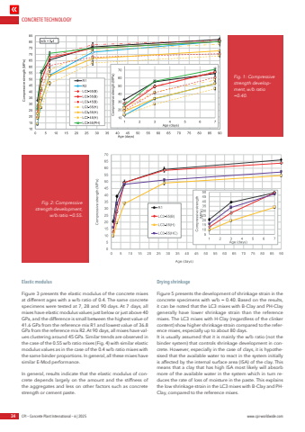 CONCRETE TECHNOLOGY34 CPI %u2013 Concrete Plant International %u2013 6 | 2025 www.cpi-worldwide.comElastic modulusFigure 3 presents the elastic modulus of the concrete mixes at different ages with a w/b ratio of 0.4. The same concrete specimens were tested at 7, 28 and 90 days. At 7 days, all mixes have elastic modulus values just below or just above 40 GPa, and the difference is small between the highest value of 41.6 GPa from the reference mix R1 and lowest value of 36.8 GPa from the reference mix R2. At 90 days, all mixes have values clustering around 45 GPa. Similar trends are observed in the case of the 0.55 w/b ratio mixes (Fig. 4) with similar elastic modulus values as in the case of the 0.4 w/b ratio mixes with the same binder proportions. In general, all these mixes have similar E-Mod performance. In general, results indicate that the elastic modulus of concrete depends largely on the amount and the stiffness of the aggregates and less on other factors such as concrete strength or cement paste. Drying shrinkage Figure 5 presents the development of shrinkage strain in the concrete specimens with w/b = 0.40. Based on the results, it can be noted that the LC3 mixes with B-Clay and PH-Clay generally have lower shrinkage strain than the reference mixes. The LC3 mixes with H-Clay (regardless of the clinker content) show higher shrinkage strain compared to the reference mixes, especially up to about 80 days.It is usually assumed that it is mainly the w/b ratio (not the binder system) that controls shrinkage development in concrete. However, especially in the case of clays, it is hypothesised that the available water to react in the system initially is affected by the internal surface area (ISA) of the clay. This means that a clay that has high ISA most likely will absorb more of the available water in the system which in turn reduces the rate of loss of moisture in the paste. This explains the low shrinkage strain in the LC3 mixes with B-Clay and PHClay, compared to the reference mixes. Fig. 1: Compressive strength development, w/b ratio =0.40. Fig. 2: Compressive strength development, w/b ratio =0.55.
