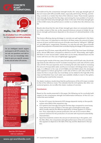 CONCRETE TECHNOLOGYCPI %u2013 Concrete Plant International %u2013 6 | 2025 www.cpi-worldwide.comAs evidenced by the compressive strength results, the early age strength gain of the LC3 mixes with 55% and 65% clinker, especially with B-Clay, PH-Clay, and HCClay, is similar to or better than that of the reference mixes. These binder systems react strongly during the first few days, overcoming the main problem of most binary mixes with slow early strength gain. Even in the case of the slow strength gain of the LC3(H) mixes, the performance is similar to or better than the reference mix R2.Results also show that the rate of later strength gain does not necessarily depend on clinker content of the mix, as the required minimum amount of clinker for optimum strength performance depends on the amount of calcined kaolinite in the clay.The factors affecting drying shrinkage in concrete are well explained in the literature. In this case, it is important to note that in all these mixes, the amount of water, amount of stone and the total amount of binder were fixed at 160 kg/m%u00b3, 1000 kg/m%u00b3, and 400 kg/m%u00b3, respectively. Therefore, it is only the w/b ratio, type of binder and/or the proportion of binders that controlled drying shrinkage of the specimens.In general, the LC3 mixes, especially with B-Clay and PH-Clay, have lower shrinkage strain, almost 50% lower compared to reference mix R1. Presumably, with higher ISA there is more %u2018bound water%u2019 initially that can be slowly released back into the matrix with time as in the case of lightweight aggregates.Comparing the results of the two cases, 0.4 w/b ratio and 0.55 w/b ratio, the shrinkage strain for the reference mix R1 increases moving from a w/b ratio of 0.4 to a w/b ratio of 0.55. This was expected, since increasing the w/b ratio leads to increasing the amount of evaporable water, and thus an increase in shrinkage strains. Surprisingly, it is different in the case of LC3-55(B) and LC3-55(H) where the shrinkage strain appears to reduce going from a w/b ratio of 0.4 to a w/b ratio of 0.55. The reason for this is not yet clear, but most likely can be related to the high ISA of the clays and therefore how much water was available initially to react in the system, something that need further research. For elastic modulus, results show that the performance of the LC3 mixes is similar to that of the reference mixes. This indicates that the LC3 systems, like other conventional systems, do not affect the elastic modulus of concrete. ConclusionsBased on the results presented in this paper, the following can be concluded with respect to the compressive strength and deformation behaviour of the LC3 concretes that were studied:%u2022 For the LC3 mixes, the demand of SP dosage depends mainly on the specific surface area (SSA) of the respective clay.%u2022 LC3 systems react strongly during the first few days compared to most binary mixes where the main problem is the slow gain of strength at early ages, which usually restricts the effective application of these systems in construction. Thus, especially for precast production, the use of LC3 cement offers practical solutions for the production of concrete with improved sustainability characteristics. %u2022 Apart from kaolinite content, the amount of calcined clay in the system, and the filler effect, the compressive strength performance of the LC3 concretes also appears to depend on the SSA of the clay and the alkali level in the system. CONCRETE PLANTINTERNATIONALTRADE JOURNALS FOR THE CONCRETE INDUSTRYAsk me a question.Hello, i%u00b4m CPi Chat!What is recycled concrete?Recycled concrete aggregates (RCA) are concrete waste that can be classified as fine recycled concrete aggregates (fRCA) and coarse recycled concrete aggregates (cRCA). RCA is typically free of masonry or brick components of construction and demolition waste (C&DW), as these materials have porous microstructures that significantly affect the properties of RCA [1]. RCA can be simplified as a two-phase composite material...This link will take you directly to the article:%u2022 [1] The use of recycled aggregates to produce concrete productsHello, i%u00b4mthe AI chatbot from CPI worldwide for the precast concrete industryI%u2018m an intelligent search engine and expert in all CPI contents. You can ask me questions and talk to me. I%u2018ll use our knowledge database to give you specific answers to this and all other CPI articles. www.cpi-worldwide.comTest the CPI Chat and visit our website: