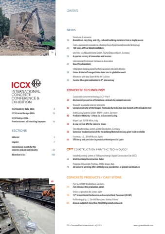 CPI %u2013 Concrete Plant International %u2013 6 | 2025 www.cpi-worldwide.comCONTENTSNEWSSmart use of resources 16 Demolition, recycling, and CO2-reduced building materials from a single sourceFrom a passionate innovator to a leading force of prestressed concrete technology20 100 years of Paul Maschinenfabrikwbr Rohr- und Bauelemente GmbH, 75248 %u00d6lbronn-D%u00fcrrn, Germany24 A quarter century of innovation and successInternational Prestressed Hollowcore Association27 New IPHA President Integration marks a pivotal further expansion into Latin America28 Lintec & Linnhoff merges Lintec-Ixon into its global networkMilestone with New State-of-the-Art Facilities30 Curetec Shanghai celebrates its 5th anniversaryCONCRETE TECHNOLOGYSustainable concrete technology, LC3 %u2013 Part 132 Mechanical properties of limestone calcined clay cement concrete Research on precast concrete elements40 Complementarity of the Oxygen Permeability Index test and Torrent air Permeability testKraft Curing Systems GmbH, 49699 Lindern, Germany 48 Predictive Maturity %u2013 A New Era in Concrete CuringMapei SpA, 20158 Milan, Italy 54 A new service: EPD for concrete mixesTeka Maschinenbau GmbH, 67480 Edenkoben, Germany 58 Extensive modernisation of the Heidelberg Materials mixing plant in AhrensfeldeFrumecar, S.L., 30169 Murcia, Spain66%u0009 Efficiency and precision in precast at Hormipresa in SpainInstalled printing system at TU Braunschweig%u2019s Digital Construction Site (DSC)68 Multifunctional Construction Robot Progress 3D Concrete Printing, 39042 Brixen, Italy70 3D concrete printing offers entirely new possibilities in precast constructionCONCRETE PRODUCTS / CAST STONEPeri SE, 89264 Wei%u00dfenhorn, Germany 74 Fact check on the production palletOnline registration for visitors open78 13th International Conference on Concrete Block Pavement (ICCBP)Polblat Kopyt Sp. J., 26-640 Skaryszew, Mak%u00f3w, Poland82 Annual output of more than 100,000 production boardsICCX Academy Baku 2026 8ICCX Central Europe 2026 10ICCX T%u00fcrkiye 2026 %u2013 Premiere event with exciting keynotes 14SECTIONSEditorial 3Imprint 7International events for the concrete and precast industry 23Advertiser%u2019s list 188INTERNATIONAL CONCRETECONFERENCE & EXHIBITION4816