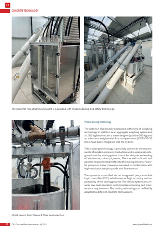 CONCRETE TECHNOLOGY62 CPI %u2013 Concrete Plant International %u2013 6 | 2025 www.cpi-worldwide.comPrecise dosing technologyThe system is also broadly positioned in the field of weighing technology: in addition to an aggregate weighing system and a 1,500 kg binder scale, a water weigher (positive 500 kg) and an admixture weigher with four compartments (15/15/15/30 litres) have been integrated into the system.Teka's dosing technology is precisely tailored to the requirements of modern concrete production and is seamlessly integrated into the mixing plants. It enables the precise feeding of admixtures, colour pigments, fillers as well as liquid and powder components directly into the mixing process. Powerful pumps or screw conveyors are used in combination with high-resolution weighing cells and flow sensors.The system is controlled via an integrated programmable logic controller (PLC), which ensures high accuracy and repeatability of the dosing process. The closed system also ensures low-dust operation and minimises cleaning and maintenance requirements. The dosing technology can be flexibly adapted to different concrete formulations.The Mixomat THZ 3000 mixing plant is equipped with modern dosing and safety technology.OLAS sensor from Werne & Thiel sensortechnic