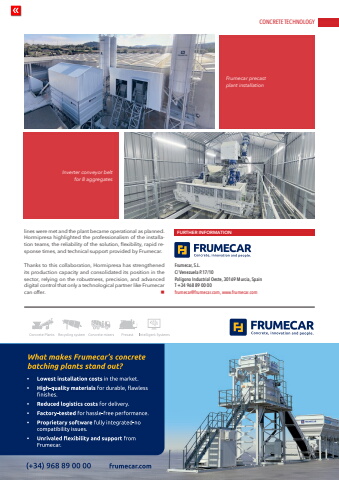 CONCRETE TECHNOLOGYwww.cpi-worldwide.com CPI %u2013 Concrete Plant International %u2013 6 | 2025 67lines were met and the plant became operational as planned. Hormipresa highlighted the professionalism of the installation teams, the reliability of the solution, flexibility, rapid response times, and technical support provided by Frumecar.Thanks to this collaboration, Hormipresa has strengthened its production capacity and consolidated its position in the sector, relying on the robustness, precision, and advanced digital control that only a technological partner like Frumecar can offer. nFURTHER INFORMATIONFrumecar, S.L.C/ Venezuela P.17/10 Pol%u00edgono Industrial Oeste, 30169 Murcia, SpainT +34 968 89 00 00frumecar@frumecar.com, www.frumecar.comFrumecar precast plant installationInverter conveyor belt for 8 aggregates