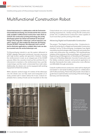 68 CPI %u2013 Concrete Plant International %u2013 6 | 2025 www.cpi-worldwide.comCobod International, in collaboration with the Technische Universit%u00e4t Braunschweig, has introduced the first commercially available multifunctional construction robot. Built on Cobod%u2019s 3D construction printing technology, the jointly developed system by Cobod and Institute for Structural Design (ITE) integrates a telescopic vertical extension unit with a robotic arm that enables the Shotcrete 3D Printing Process (SC3DP). However, the telescopic tool is not limited to shotcrete applications, multiple other tools can also be mounted onto the vertical telescopic unit. TU Braunschweig intends to use the system delivered to SC3DP digitally fabricated reinforced concrete structures with high surface quality and geometric freedom. Hereby the reinforcement is seen as an integral part of the SC3DP process: Either the concrete is built up first and then the reinforcement is inserted, or the reinforcement has a pre-fabricated shape and the mesh is shotcreted from both sides. Additionally, the robotic arm can be equipped with sanding equipment to finish the surfaces. With a dynamic vertical range of 3 meters of the telescopic unit, the robotic arm can fully reach and manipulate an already printed wall 3 meters below the X-axis. Cobod emphasizes that a variety of tools can be mounted on the new Cobod robotic arm, such as a paint spray gun, insulation tool, sanding equipment etc., hereby turning the 3D construction printer into a multifunctional construction robot capable of much more than just the printing of the wallsAdvancing Digital and Sustainable Construction The project, \dustry 4.0 as the Key to a Digital and Sustainable Construction Industry)%u201d led by TU Braunschweig, investigates how digital manufacturing technologies affect planning and production under real construction site conditions. The interdisciplinary initiative of the Institutes of Structural Design, of Construction Engineering and Management, of Geodesy and Photogrammetry and of Building Materials, Concrete Construction and Fire Safety combines research and practical application to develop frameworks that make construction more effective and affordable through automation.Cobod%u2019s multifunctional construction robot will be deployed and tested in real-world building projects in collaboration with TU Braunschweig. These tests will provide critical data to guide future implementation and scaling of the technology in Germany and internationally. nMultifunctional Construction Robot Installed printing system at TU Braunschweig%u2019s Digital Construction Site (DSC)%u00a9 COBOD InternationalTU Braunschweig intends to use Cobod%u2019s multifunctional construction system to fabricate reinforced double curved walls.