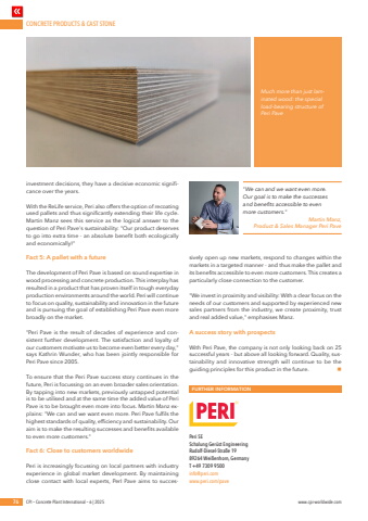 CONCRETE PRODUCTS & CAST STONE76 CPI %u2013 Concrete Plant International %u2013 6 | 2025 www.cpi-worldwide.cominvestment decisions, they have a decisive economic significance over the years. With the ReLife service, Peri also offers the option of recoating used pallets and thus significantly extending their life cycle. Martin Manz sees this service as the logical answer to the question of Peri Pave's sustainability: \to go into extra time - an absolute benefit both ecologically and economically!\Fact 5: A pallet with a future The development of Peri Pave is based on sound expertise in wood processing and concrete production. This interplay has resulted in a product that has proven itself in tough everyday production environments around the world. Peri will continue to focus on quality, sustainability and innovation in the future and is pursuing the goal of establishing Peri Pave even more broadly on the market. \sistent further development. The satisfaction and loyalty of our customers motivate us to become even better every day,\says Kathrin Wunder, who has been jointly responsible for Peri Pave since 2005. To ensure that the Peri Pave success story continues in the future, Peri is focussing on an even broader sales orientation. By tapping into new markets, previously untapped potential is to be utilised and at the same time the added value of Peri Pave is to be brought even more into focus. Martin Manz explains: \highest standards of quality, efficiency and sustainability. Our aim is to make the resulting successes and benefits available to even more customers.\Fact 6: Close to customers worldwide Peri is increasingly focussing on local partners with industry experience in global market development. By maintaining close contact with local experts, PerI Pave aims to successively open up new markets, respond to changes within the markets in a targeted manner - and thus make the pallet and its benefits accessible to even more customers. This creates a particularly close connection to the customer. \needs of our customers and supported by experienced new sales partners from the industry, we create proximity, trust and real added value,\A success story with prospects With Peri Pave, the company is not only looking back on 25 successful years - but above all looking forward. Quality, sustainability and innovative strength will continue to be the guiding principles for this product in the future. nFURTHER INFORMATIONPeri SE Schalung Ger%u00fcst Engineering Rudolf-Diesel-Stra%u00dfe 19 89264 Wei%u00dfenhorn, Germany T +49 7309 9500 info@peri.com www.peri.com/pave\Our goal is to make the successes and benefits accessible to even more customers.\Martin Manz, Product & Sales Manager Peri Pave Much more than just laminated wood: the special load-bearing structure of Peri Pave