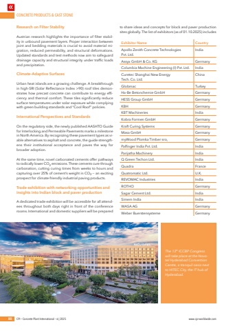 CONCRETE PRODUCTS & CAST STONE80 CPI %u2013 Concrete Plant International %u2013 6 | 2025 www.cpi-worldwide.comResearch on Filter StabilityAustrian research highlights the importance of filter stability in unbound pavement layers. Proper interaction between joint and bedding materials is crucial to avoid material migration, reduced permeability, and structural deformations. Updated standards and test methods now aim to safeguard drainage capacity and structural integrity under traffic loads and precipitation.Climate-Adaptive SurfacesUrban heat islands are a growing challenge. A breakthrough in high-SRI (Solar Reflectance Index >90) roof tiles demonstrates how precast concrete can contribute to energy efficiency and thermal comfort. These tiles significantly reduce surface temperatures under solar exposure while complying with green building standards and %u201cCool Roof%u201d policies.International Perspectives and StandardsOn the regulatory side, the newly published AASHTO Guide for Interlocking and Permeable Pavements marks a milestone in North America. By recognizing these pavement types as viable alternatives to asphalt and concrete, the guide strengthens their institutional acceptance and paves the way for broader adoption.At the same time, novel carbonated cements offer pathways to radically lower CO2 emissions. These cements cure through carbonation, cutting curing times from weeks to hours and capturing over 25% of cement%u2019s weight in CO2 %u2014 an exciting prospect for climate-friendly industrial paving products.Trade exhibition with networking opportunities and insights into Indian block and paver productionA dedicated trade exhibition will be accessible for all attendees throughout both days right in front of the conference rooms. International and domestic suppliers will be prepared to share ideas and concepts for block and paver production sites globally. The list of exhibitors (as of 01.10.2025) includesExhibitor Name CountryApollo Zenith Concrete Technologies Pvt. Ltd.IndiaAssyx GmbH & Co. KG GermanyColumbia Machine Engineering (I) Pvt. Ltd. IndiaCuretec Shanghai New Energy Tech. Co. Ltd.ChinaGlobmac TurkeyHa-Be Betonchemie GmbH GermanyHESS Group GmbH GermanyKBH GermanyKBT Machineries IndiaKobra Formen GmbH GermanyKraft Curing Systems GermanyMasa GmbH GermanymyWood Plomka Timber sro, GermanyPalfinger India Pvt. Ltd. IndiaParijatha Machinery IndiaQ Green Techon Ltd. IndiaQuadra FranceQuatromatic Ltd. U.K.REVOMAC Industries IndiaROTHO GermanySagar Cement Ltd. IndiaSimem India IndiaWASA AG GermanyWeber Buerstensysteme GermanyThe 13th ICCBP Congress will take place at the Novotel Hyderabad Convention Centre, a tranquil oasis next to HITEC City, the IT hub of Hyderabad.