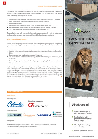 CONCRETE PRODUCTS & CAST STONEwww.cpi-worldwide.com CPI %u2013 Concrete Plant International %u2013 6 | 2025FURTHER INFORMATIONwww.iccbp.orgPlatinum sponsorDiamond sponsorsGold sponsorsKBT Machineries, Bengaluru | Kobra Formen GmbH, Germany | Sagar Cements Ltd., Hyderabad SIMEM India , Vadodara | Palfinger India Pvt Ltd., ChennaiInternational media partnerOn April 11, a complimentary plant tour will be offered to the delegates, presenting a typical paver block production at Earth Pavers Pvt. Ltd. In Hyderabad. The equipment operating in this plant includes%u2022 Columbia (India make) SPM30 Concrete Block Machine Pallet size 750x600 : Fully automated plant with Cuber and Kraft Curing System. %u2022 Besser%u2019s Bescopac%u2022 Parijatha (India make) Hermetic Press - 3 stations (APM316 ED)%u2022 KBT Machinery (India make) Vacuum Wet Press Single Station - WP400%u2022 Shot Blast Machine from Patel Furnace and Forging Pvt. Ltd.This exclusive tour will provide Indian make equipment, with a mix of automated and manual processes to produce different block and paver products.Why Attend ICCBP 2026?ICCBP is not just a scientific conference%u2014it is a global meeting place for innovators, manufacturers, city planners, researchers, and policy-makers. Participants benefit from:%u2022 Cutting-edge research presentations covering materials, design, and sustainability.%u2022 Best practice case studies from around the world.%u2022 An international exhibition showcasing the latest technologies, machines, and materials.%u2022 Networking opportunities with leading experts shaping the future of urban infrastructure.Hyderabad, as a rapidly expanding metropolis, provides the perfect backdrop. Here, urban growth, sustainability challenges, and infrastructure development converge, reflecting the core issues addressed by ICCBP. The ICCBP Congress will take place in the Novotel Hyderabad Convention Centre Novotel & HICC Complex and special rates for conference participants are agreed that are accessible through the ICCBP website where you can also register online, of course. nEVEN THE KING CAN%u2018T HARM ITwww.mywood.de info@mywood.deUPadvancedSturdy wooden core with waterproof gluingSingle planks with predominantly vertical annual ringsWood-plastic coating on both sidesClosed, joint-free surface