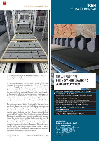 CONCRETE PRODUCTS & CAST STONEwww.cpi-worldwide.com CPI %u2013 Concrete Plant International %u2013 6 | 2025The collaboration between Kamal and Polblat began in 2022, when the paving block manufacturer decided to purchase more than 4,000 polyurethane-coated production boards. This marked the first step towards a long-term partnership, the success of which depended on the quality and durability of the supplied solutions. For three years, the boards were in continuous use on Kamal%u2019s production lines - and their reliability and resistance under demanding conditions impressively confirmed the quality standards promised by Polblat.The experience gained during this period led to a further and significantly larger investment. In 2025, Kamal ordered more than ten thousand polyurethane-coated plywood boards from the Polish manufacturer. They were used on two production lines, including a new line in Rypin, equipped with a concrete block machine from the German company Rekers. Thanks to its special design, the machine allows the production of thin fa%u00e7ade elements with a thickness starting from 18 mm, as well as the integration of components for the manufacture of reinforced concrete products. The latter is achieved through a transverse product configuration. This modern production facility also incorporates multiple energy recovery systems, resulting in significantly lower power consumption compared to many conventional solutions.Polyurethane-coated production boards at the Cucereavii Alexandr plant in Moldova.