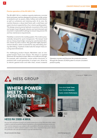 CONCRETE PRODUCTS & CAST STONEwww.cpi-worldwide.com CPI %u2013 Concrete Plant International %u2013 6 | 2025 91Precise operation of the RH 600-3 VA The RH 600-3 VA is a medium-capacity stationary concrete block and paver machine designed to produce a wide variety of products such as pavers, slabs, hollow and solid blocks, as well as curbstones and retaining walls. At its core, the machine features a robust steel frame with a solid base and upper structure supported by a four-column guiding system. This design ensures precise hydraulic movement of the mold and tamper head. All guide columns are hard-chromed and mounted in replaceable bushings to ensure long service life and low maintenance requirements.Flexibility is central to the molding system. The mold is pneumatically clamped for quick changeovers. The tamper head sits on a heavy-duty bridge carrying two synchronized vibrators. Driven by servo motors, they generate highly dynamic, vertical vibration, which is essential for easy demolding. During demolding, a hydraulic brake locks the tamper head, securing exact dimensions. For challenging product shapes, Micheletto uses an integrated tamper head cross cleaner. This device is applied whenever the standard scraper effect is not sufficient enough, for example, with curbstones, coarse surface structures, or products with curved geometries. A scraper arm, driven by an electric geared motor and roller chain, moves crosswise Operators monitor and fine-tune the production process through the Siemens SCADA system to ensure consistent product quality.www.hessgroup.comDiscover the unmatched strength and perfect performance of the HESS RH 2000-4 MVAcrafted to meet and exceed the highest standards in concrete block and paver production.This machine empowers your projects with unparalleled effi ciency, combining durability with precision to deliver optimal results in every stone. Experience how power refi nedinto perfection sets new benchmarks in concrete manufacturing.We put concrete into shape.Extra short Cycle TimesUser-friendly OperationHighly reliable PerformanceWHERE POWERMEETSPERFECTIONHESS RH 2000-4 MVADownloadbrochures