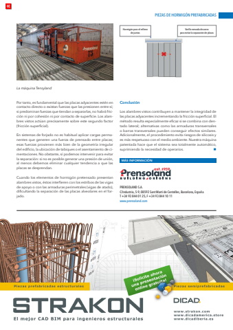 PIEZAS DE HORMIG%u00d3N PREFABRICADASwww.cpi-worldwide.com PHI %u2013 Planta de Hormig%u00f3n Internacional %u2013 6 | 2025 105Por tanto, es fundamental que las placas adyacentes est%u00e9n en contacto directo o existan fuerzas que las presionen entre s%u00ed; si predominan fuerzas que tiendan a separarlas, no habr%u00e1 fricci%u00f3n ni por cohesi%u00f3n ni por contacto de superficie. Los alambres vistos act%u00faan precisamente sobre este segundo factor (fricci%u00f3n superficial).En sistemas de forjado no es habitual aplicar cargas permanentes que generen una fuerza de prensado entre placas; esas fuerzas provienen m%u00e1s bien de la geometr%u00eda irregular del edificio, la ubicaci%u00f3n de tabiques o el asentamiento de cimentaciones. No obstante, s%u00ed podemos intervenir para evitar la separaci%u00f3n: si no es posible generar una presi%u00f3n de uni%u00f3n, al menos debemos eliminar cualquier tendencia a que las placas se desprendan.Cuando los elementos de hormig%u00f3n pretensado presentan alambres vistos, %u00e9stos interfieren con los estribos de las vigas de apoyo o con las armaduras perimetrales (vigas de atado), dificultando la separaci%u00f3n de las placas alveolares en el forjado.Conclusi%u00f3nLos alambres vistos contribuyen a mantener la integridad de las placas adyacentes incrementando la fricci%u00f3n superficial. El m%u00e9todo resulta especialmente eficaz si se combina con dentado lateral; alternativas como las armaduras transversales o barras transversales pueden conseguir efectos similares. Adicionalmente, el procedimiento evita riesgos de silicosis y es m%u00e1s respetuoso con el medio ambiente. Nuestra m%u00e1quina patentada hace que el sistema sea totalmente autom%u00e1tico, suprimiendo la necesidad de operarios. n M%u00c1S INFORMACI%u00d3NPRENSOLAND S.A.C/Industria, 5-9, 08592 Sant Mart%u00ed de Centelles, Barcelona, Espa%u00f1aT +34 93 844 01 25, F +34 93 844 10 11www.prensoland.com La m%u00e1quina TensylandHormig%u00f3n para el relleno de juntas Varilla nervada de acero para evitar la separaci%u00f3n de placas