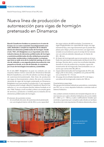 PIEZAS DE HORMIG%u00d3N PREFABRICADAS106 PHI %u2013 Planta de Hormig%u00f3n Internacional %u2013 6 | 2025 www.cpi-worldwide.comBianchi Casseforme fortalece su presencia en el norte de Europa con un nuevo suministro tecnol%u00f3gicamente avanzado, destinado a cumplir los requisitos de la industria danesa de elementos prefabricados de hormig%u00f3n. Desde el a%u00f1o 1961, A/S Boligbeton es un importante actor de la industria danesa de elementos prefabricados de hormig%u00f3n y suministra prefabricados de alta calidad para proyectos comerciales, residenciales e institucionales. La empresa, que tiene su sede cerca de la ciudad de L%u00f8sning, en el coraz%u00f3n de Jutlandia, y una segunda planta de producci%u00f3n m%u00e1s peque%u00f1a en Kors%u00f8r, en la isla de Selandia, se caracteriza por el uso de tecnolog%u00edas innovadoras y sostenibles.En el a%u00f1o 2007, Boligbeton se puso en contacto con una empresa italiana menos conocida (en Dinamarca) llamada Bianchi Casseforme, con el fin de solicitar una l%u00ednea de vigas de autorreacci%u00f3n/autotensado. Esta l%u00ednea de producci%u00f3n a%u00fan sigue en funcionamiento a diario. De cara a la creciente demanda de vigas de hormig%u00f3n pretensado en Dinamarca, Boligbeton tuvo que ampliar su producci%u00f3n. Y, por supuesto, la empresa volvi%u00f3 a elegir a Bianchi Casseforme. Bianchi Casseforme s.r.l. es una empresa familiar italiana fundada en el a%u00f1o 1964. Trabaja a nivel mundial y ofrece una amplia gama de servicios y productos a medida para la industria de los elementos prefabricados de hormig%u00f3n.El volumen de suministro inclu%u00eda:1. Un encofrado de acero de autorreacci%u00f3n/autotensado con una longitud interior %u00fatil de 30 m y una capacidad de carga m%u00e1xima de 600 toneladas. Consistente en vigas longitudinales con capacidad de carga, una viga transversal fija y otra viga transversal que se puede desplazar para relajar y tensar los torones. Las vigas transversales se suministraron para el anclaje de los torones con una ret%u00edcula est%u00e1ndar deseada por el cliente de 40 %u00d7 40 mm.2. El chasis de hormigonado que se encuentra en el encofrado de autorreacci%u00f3n/autotensado de Bianchi de 29 m de largo. Permite abrir y cerrar los encofrados laterales durante el ciclo de producci%u00f3n y emplear capas inferiores/suelos de hormigonado intercambiables con un ancho que oscila entre 40 y 80 cm.3. Capas inferiores/suelos de hormigonado de 29 m de largo y 50 cm de ancho, completos con juntas de PVC con un bisel de 15 %u00d7 15 mm.4. Un juego de encofrados laterales de 29 m de largo y una altura de hormigonado m%u00e1xima de 100 cm.Caracter%u00edsticas especiales:Dos grupos de bombas hidr%u00e1ulicas autom%u00e1ticos, controlados por PLC con un %u00fanico dep%u00f3sito hidr%u00e1ulico controlan todo el sistema hidr%u00e1ulico.Una unidad controla el sistema de tensado/relajaci%u00f3n de varios torones con cuatro cilindros hidr%u00e1ulicos de acci%u00f3n doble (2 %u00d7 300 t y 2 %u00d7 100 t) y cuatro codificadores lineales que controlar y supervisan por completo cada cilindro en las fases de producci%u00f3n m%u00e1s importantes. El sistema desciende y eleva Nueva l%u00ednea de producci%u00f3n de autorreacci%u00f3n para vigas de hormig%u00f3n pretensado en DinamarcaBianchi Precast Group, 43045 Fornovo di Taro (PR), ItaliaL%u00ednea de producci%u00f3n de autorreacci%u00f3n