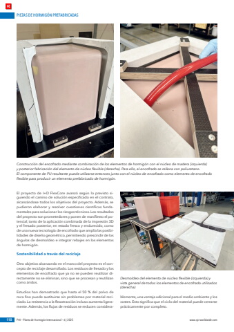 PIEZAS DE HORMIG%u00d3N PREFABRICADAS110 PHI %u2013 Planta de Hormig%u00f3n Internacional %u2013 6 | 2025 www.cpi-worldwide.comEl proyecto de I+D FlexCore avanz%u00f3 seg%u00fan lo previsto siguiendo el camino de soluci%u00f3n especificado en el contrato, alcanz%u00e1ndose todos los objetivos del proyecto. Adem%u00e1s, se pudieron elaborar y resolver cuestiones cient%u00edficas fundamentales para solucionar los riesgos t%u00e9cnicos. Los resultados del proyecto son prometedores y ponen de manifiesto el potencial, tanto de la aplicaci%u00f3n combinada de la impresi%u00f3n 3D y el fresado posterior, en estado fresco y endurecido, como de una nueva tecnolog%u00eda de encofrado que ampl%u00eda las posibilidades de dise%u00f1o geom%u00e9trico, permitiendo prescindir de los %u00e1ngulos de desmoldeo e integrar rebajes en los elementos de hormig%u00f3n.Sostenibilidad a trav%u00e9s del reciclajeOtro objetivo alcanzando en el marco del proyecto es el concepto de reciclaje desarrollado. Los residuos de fresado y los elementos de encofrado que ya no se pueden reutilizar directamente no se eliminan, sino que se procesan y reutilizan como %u00e1ridos.Estudios han demostrado que hasta el 50 % del polvo de roca fino puede sustituirse sin problemas por material reciclado. La resistencia a la flexotracci%u00f3n incluso aumenta ligeramente. Adem%u00e1s, los flujos de residuos se reducen considerablemente, una ventaja adicional para el medio ambiente y los costes. Esto significa que el ciclo del material puede cerrarse pr%u00e1cticamente por completo.Construcci%u00f3n del encofrado mediante combinaci%u00f3n de los elementos de hormig%u00f3n con el n%u00facleo de madera (izquierda) y posterior fabricaci%u00f3n del elemento de n%u00facleo flexible (derecha). Para ello, el encofrado se rellena con poliuretano. El componente de PU resultante puede utilizarse entonces junto con el n%u00facleo de encofrado como elemento de encofrado flexible para producir un elemento prefabricado de hormig%u00f3n. Desmoldeo del elemento de n%u00facleo flexible (izquierda) y vista general de todos los elementos de encofrado utilizados (derecha)