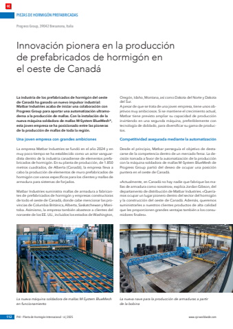 PIEZAS DE HORMIG%u00d3N PREFABRICADAS112 PHI %u2013 Planta de Hormig%u00f3n Internacional %u2013 6 | 2025 www.cpi-worldwide.comLa industria de los prefabricados de hormig%u00f3n del oeste de Canad%u00e1 ha ganado un nuevo impulsor industrial: Matbar Industries acaba de iniciar una colaboraci%u00f3n con Progress Group para aportar una automatizaci%u00f3n ultramoderna a la producci%u00f3n de mallas. Con la instalaci%u00f3n de la nueva m%u00e1quina soldadora de mallas M-System BlueMesh%u00ae, esta joven empresa se ha posicionado entre las pioneras de la producci%u00f3n de mallas de toda la regi%u00f3n.Una joven empresa con grandes ambicionesLa empresa Matbar Industries se fund%u00f3 en el a%u00f1o 2024 y en muy poco tiempo se ha establecido como un actor vanguardista dentro de la industria canadiense de elementos prefabricados de hormig%u00f3n. En su planta de producci%u00f3n, de 1.850 metros cuadrados, de Alberta (Canad%u00e1), la empresa lleva a cabo la producci%u00f3n de elementos de muro prefabricados de hormig%u00f3n con vanos espec%u00edficos para los clientes y mallas de armadura para sistemas de forjados.Matbar Industries suministra mallas de armadura a fabricantes de prefabricados de hormig%u00f3n y empresas constructoras de todo el oeste de Canad%u00e1, donde cabe mencionar las provincias de Columbia Brit%u00e1nica, Alberta, Saskatchewan y Manitoba. Asimismo, la empresa tambi%u00e9n abastece a clientes del noroeste de los EE. UU., incluidos los estados de Washington, Oreg%u00f3n, Idaho, Montana, as%u00ed como Dakota del Norte y Dakota del Sur.A pesar de que se trata de una joven empresa, tiene unos objetivos muy ambiciosos. Si se mantiene el crecimiento actual, Matbar tiene previsto ampliar su capacidad de producci%u00f3n invirtiendo en una segunda m%u00e1quina, preferiblemente con tecnolog%u00eda de doblado, para diversificar su gama de productos.Competitividad asegurada mediante la automatizaci%u00f3nDesde el principio, Matbar persegu%u00eda el objetivo de destacarse de la competencia dentro de un mercado feroz. La decisi%u00f3n tomada a favor de la automatizaci%u00f3n de la producci%u00f3n con la m%u00e1quina soldadora de mallas M-System BlueMesh de Progress Group parti%u00f3 del deseo de ocupar una posici%u00f3n puntera en el oeste de Canad%u00e1.%u00abActualmente, en Canad%u00e1 no hay nadie que fabrique las mallas de armadura como nosotros%u00bb, explica Jordan Gibson, del departamento de distribuci%u00f3n de Matbar Industries. %u00abQuer%u00edamos ocupar un lugar pionero dentro del sector del hormig%u00f3n y la construcci%u00f3n del oeste de Canad%u00e1. Adem%u00e1s, queremos suministrarles a nuestros clientes productos de alta calidad que les proporcionen grandes ventajas tambi%u00e9n a los consumidores finales%u00bb.Innovaci%u00f3n pionera en la producci%u00f3n de prefabricados de hormig%u00f3n en el oeste de Canad%u00e1Progress Group, 39042 Bresanona, ItaliaLa nueva m%u00e1quina soldadora de mallas M-System BlueMesh en funcionamientoLa nueva nave para la producci%u00f3n de armaduras a partir de la bobina